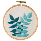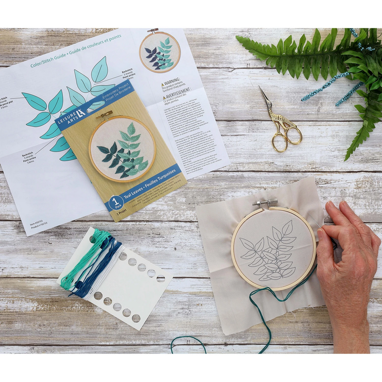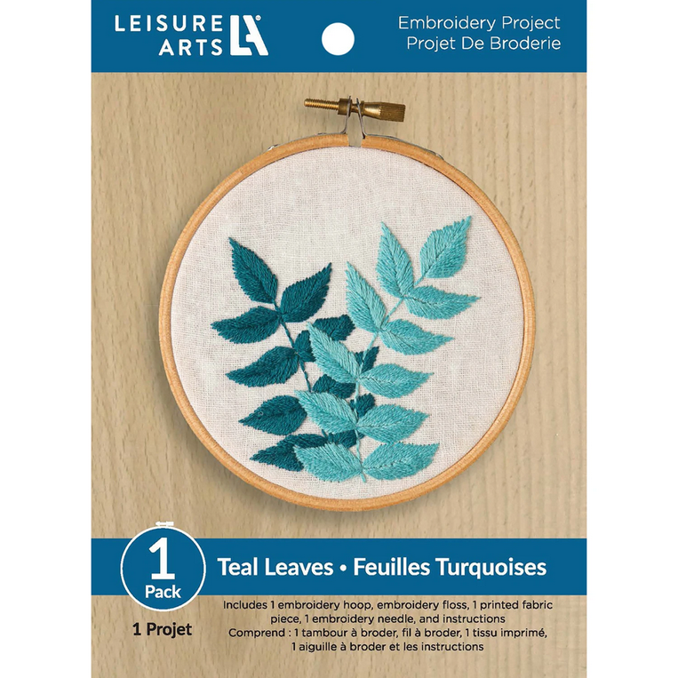 Kit contains: 1 wooden 4" embroidery hoop, 3 floss colours for a total of 7 yards, 1 piece of 7"x 7" printed fabric, 1 needle, and instructions.
