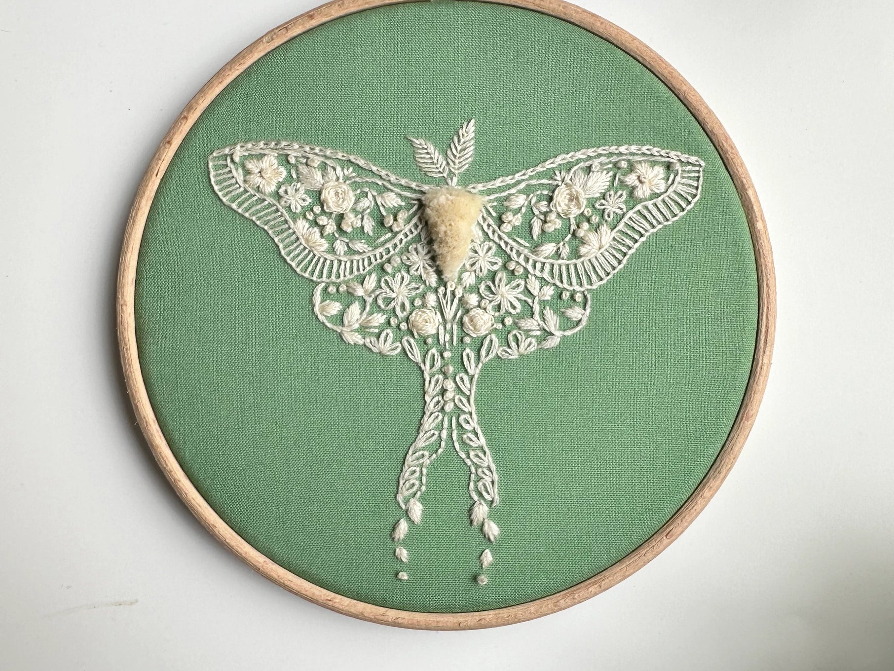The Luna Moth is a gorgeous example of how elegant these creatures can be. Moths have a bad rap as being a scary butterfly, but it is undeserved - and I promise these insects won't eat the clothes in your closet. This embroidery kit embraces muted colours and the pattern is inspired by antique lace patterns. This kit makes a 6-inch embroidered piece.