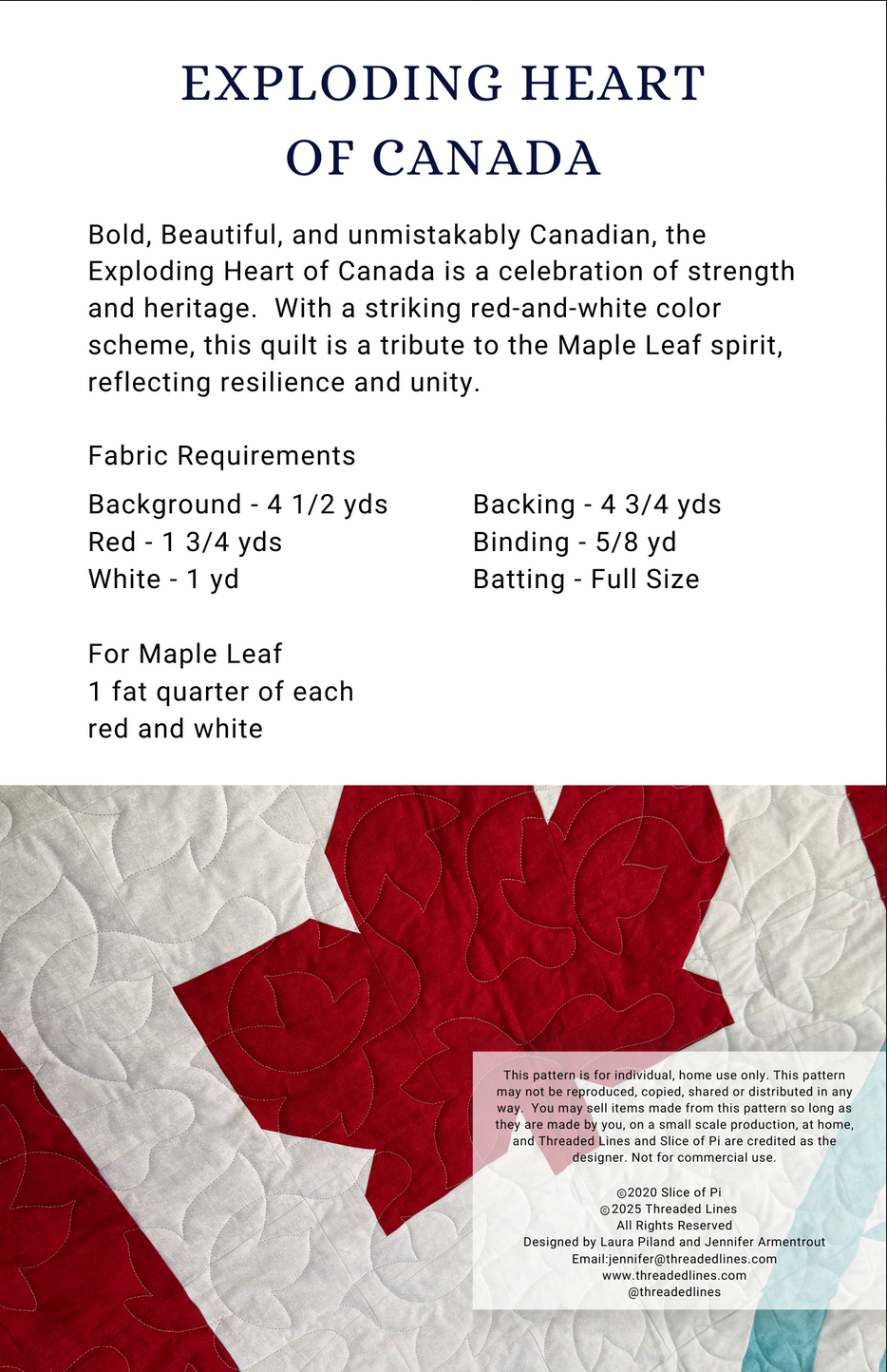Designed for advanced beginners, this pattern uses standard machine sewing techniques and is fat quarter and fabric cutter friendly. The quilt finishes at a large 72" x 72", making it an impressive addition to any room, whether for display or use. The pattern comes as a printed paper version, making it easy to follow and reference as you create this beautiful piece. This combination pattern includes the original Slice of Pi Exploding Heart pattern plus the Exploding Heart of Canada Modifications from Threaded Lines.