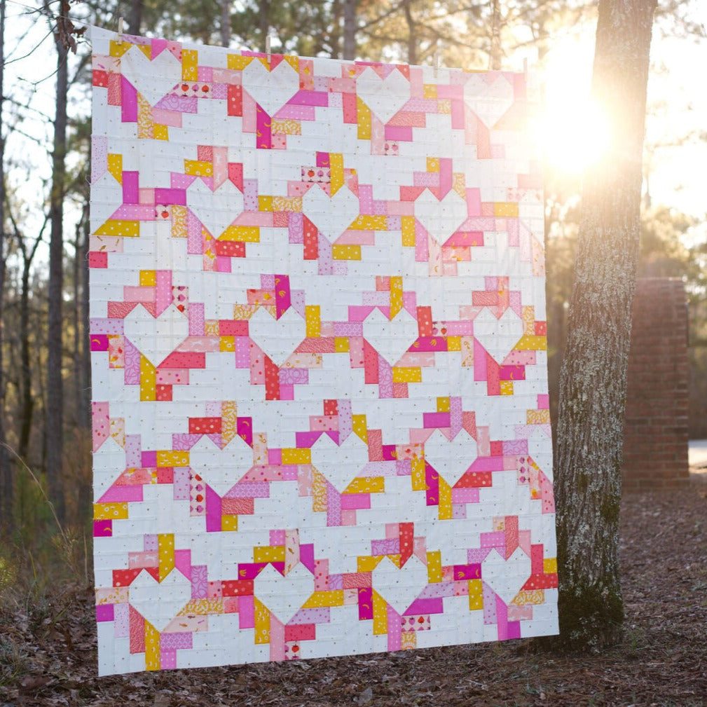 Heartspun is the perfect pattern for combining patchwork with the LOVE of all things scrappy! Grab your favorite FQs or get creative and use up your scraps…Heartspun looks lovely in any combination of prints and/or solids! This pattern also includes 2 LAYOUTS, both stacked and staggered, for two completely different looks! And remember, hearts aren’t just for Valentine’s Day!