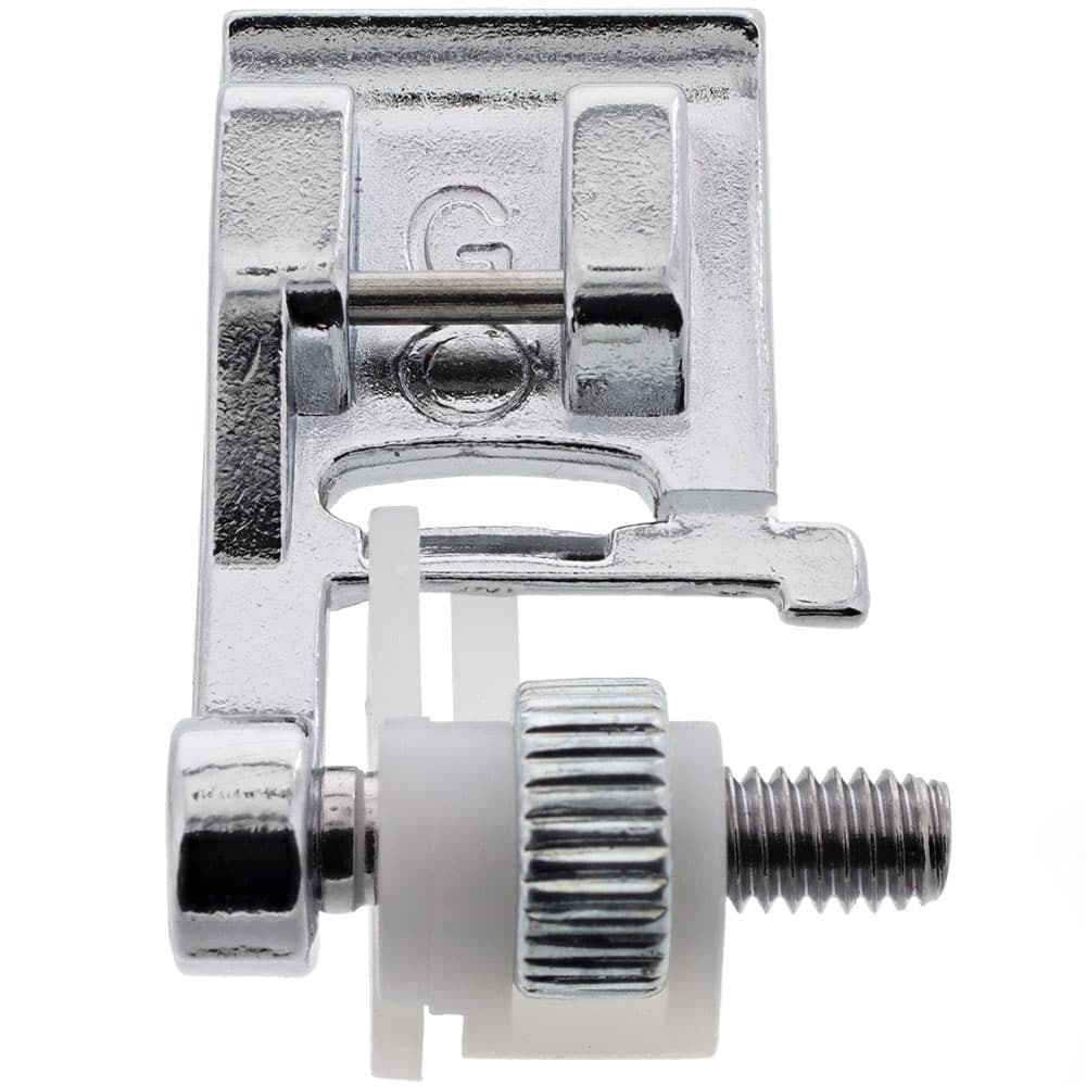 Blind hemming can sometimes be a little bit tricky so the blind hem foot goes some way to helping improve this technique. The foot has a metal guide in the center and three grooves on the underside. During blind hemming, the fold of the fabric fits snugly against the guide in the foot for accuracy wile the groove underneath help to prevent unnecessary slipping. The needle swings over the metal guide creating slack in the upper tension so that the pick of the stitch is almost invisible.