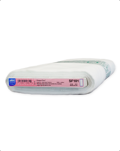 Pellon® SF101 Shape-Flex® is an all purpose, woven, fusible interfacing. It provides crisp support for collars, cuffs, yokes, pockets, facings, and other detail areas of a garment. It can also add body and permanent stability when used as a backing for needlework and punch embroidery. Shape-Flex® is intended for light to medium woven and knit fabrics, including oxford cloth, chambray, gingham, madras, tattersall, pincord, flannel, and polyester/cotton blends. To pre-shrink, fill a sink with warm water. Place interfacing in water for about ten minutes. Do not put in washer or dryer by itself or you may loosen the adhesive. Gentle squeeze out excess water and allow to dry.