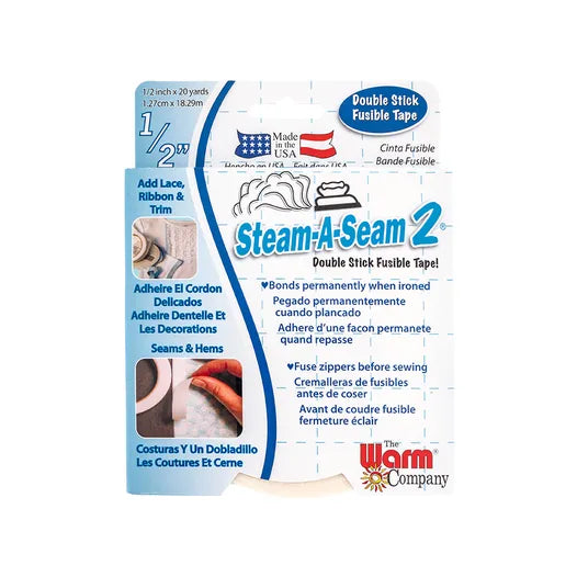 Warm Company Lite Steam A Seam 2 double stick fusible web tape. Pressure sensitive on both sides for a temporary hold to both the applique and background materials: pieces stay in place and are repositionable until fused with an iron. Once fused, the bond is permanent and machine washable and dryable. Lite is made especially for sheer and light weight fabrics and regular for use with heavier fabric, paper, cardboard, wood and glass beads. Quickly create hems, seams and applique. Easily apply lace, trim and ribbon.