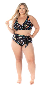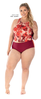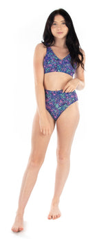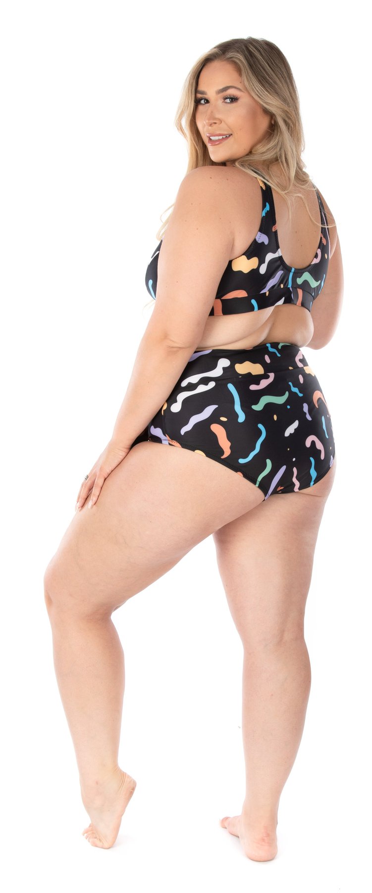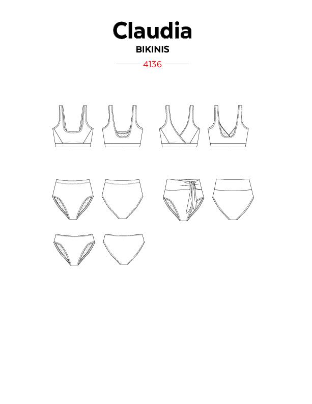 Sewing pattern for mix and match bikinis. Tops are fully lined, have a wide elasticized band at the bottom and choice of neckline