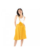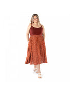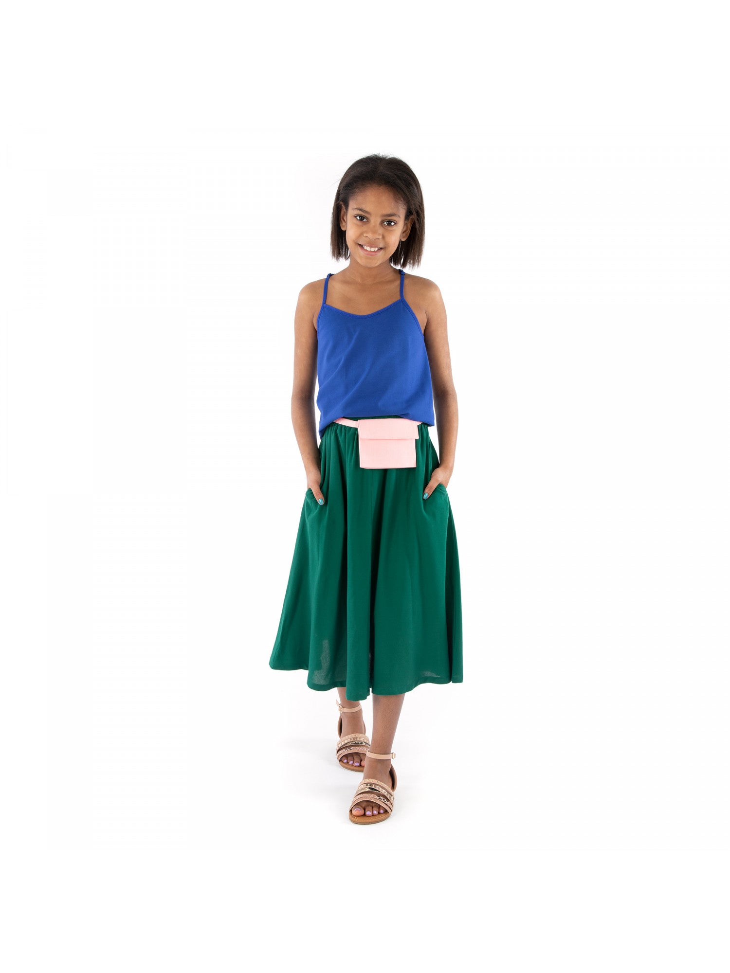 Below-the-knee or midi skirt with in-seam pockets, elasticized waistband (sits at natural waist) and optional waist pouch.