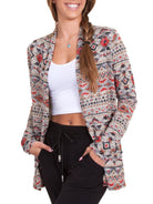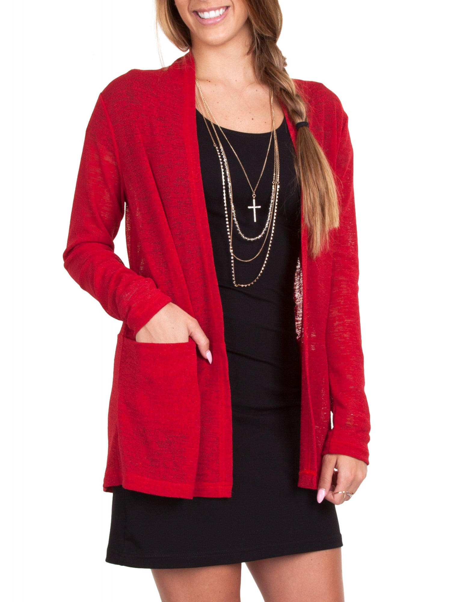 Open front cardigan with a high back neck that creates subtle draping, super-easy pocket, waist seam for color blocking, and slightly flowy lower back to give it more movement.