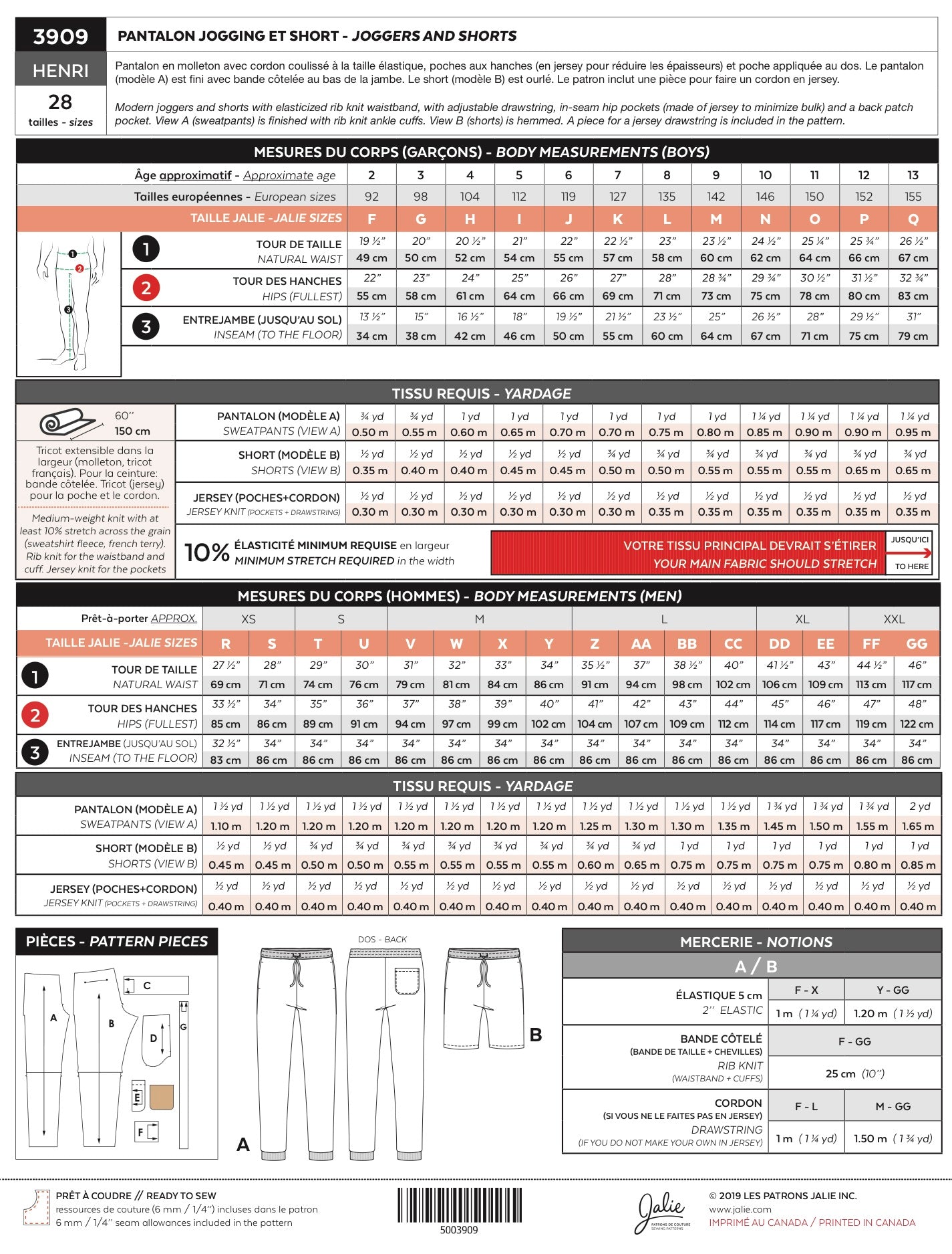 Jalie 3909 - Henri Joggers & Shorts 2yrs-XXL