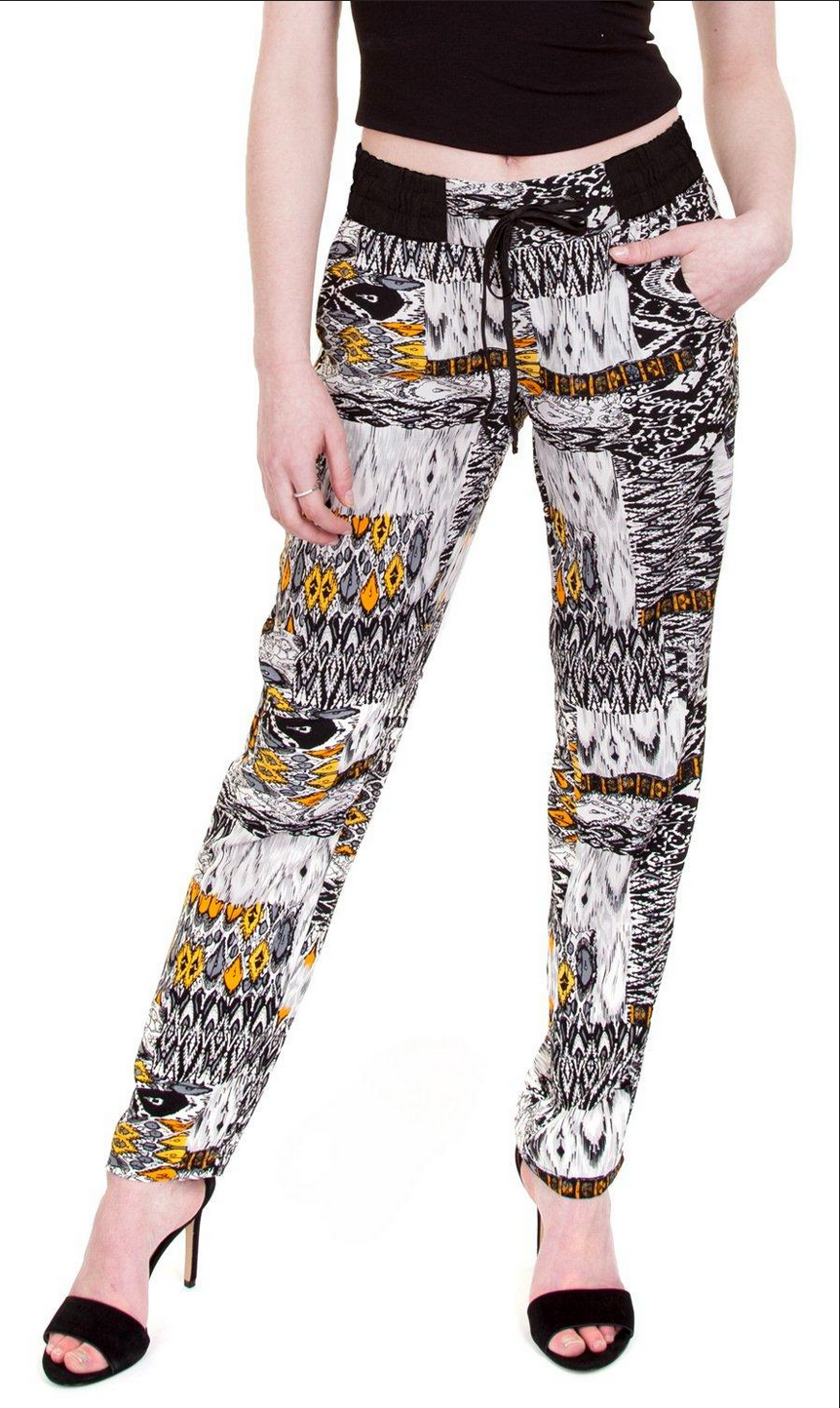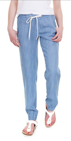 Lightweight woven pants with full elastic and drawstring waistband, tapered leg, slanted hip pockets and faux fly. A waistband inset keeps center front flat and allows for a cute color accent.