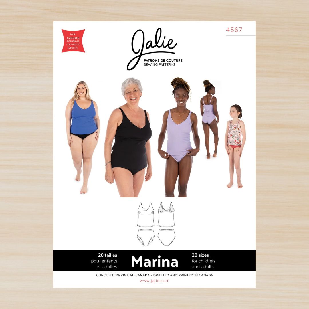 Make a timeless tankini with the MARINA sewing pattern. The V-neck top features a clever built-in shelf bra designed to hold swim cups, offering comfort and light support. The fully lined high-waist briefs sit at the navel for just the right amount of coverage.