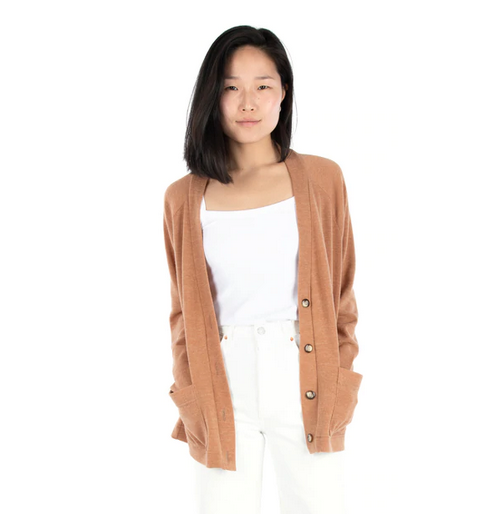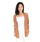 Boxy cardigan with long raglan sleeves. The neckline is finished with a wide band at the front. Two length options: sweater length, without pockets (A), and tunic length, with pockets.