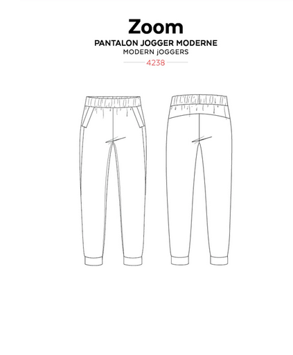 Jogger pants pattern designed for French terry. High-rise cut with wide elastic waistband, back yoke to reduce bulk, and practical hip pockets. The pocket opening and band design give a unique style to the front. These jogger pants are finished with ankle cuffs.