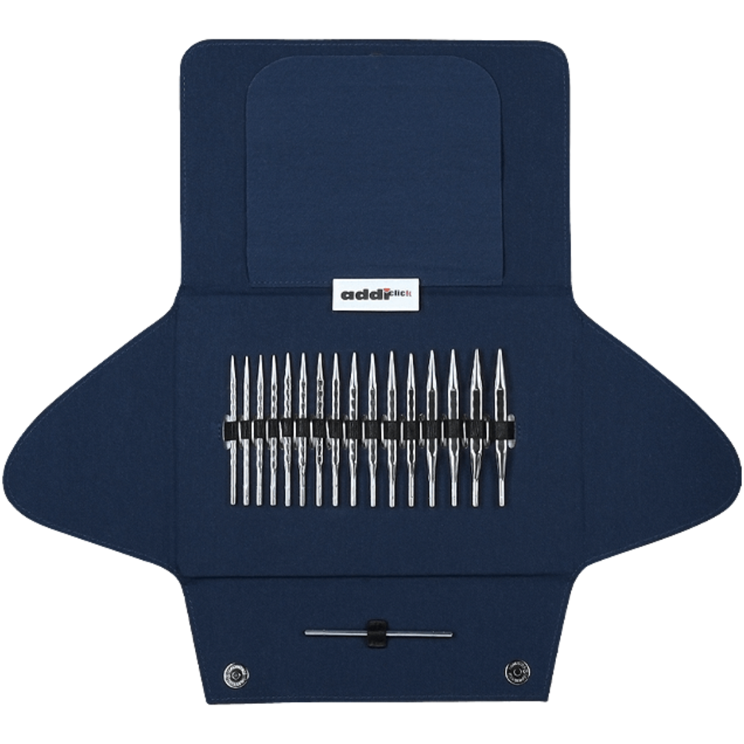 The addiClick interchangeable needle set is the only complete system which provides a patented click-in tip that will never come unscrewed while knitting. No tools are required to make a quick tip change; simply insert the cord deep into the tip, twist and release. Thanks to the Click’s revolutionary locking mechanism, the tips will remain secure until you choose to change them.