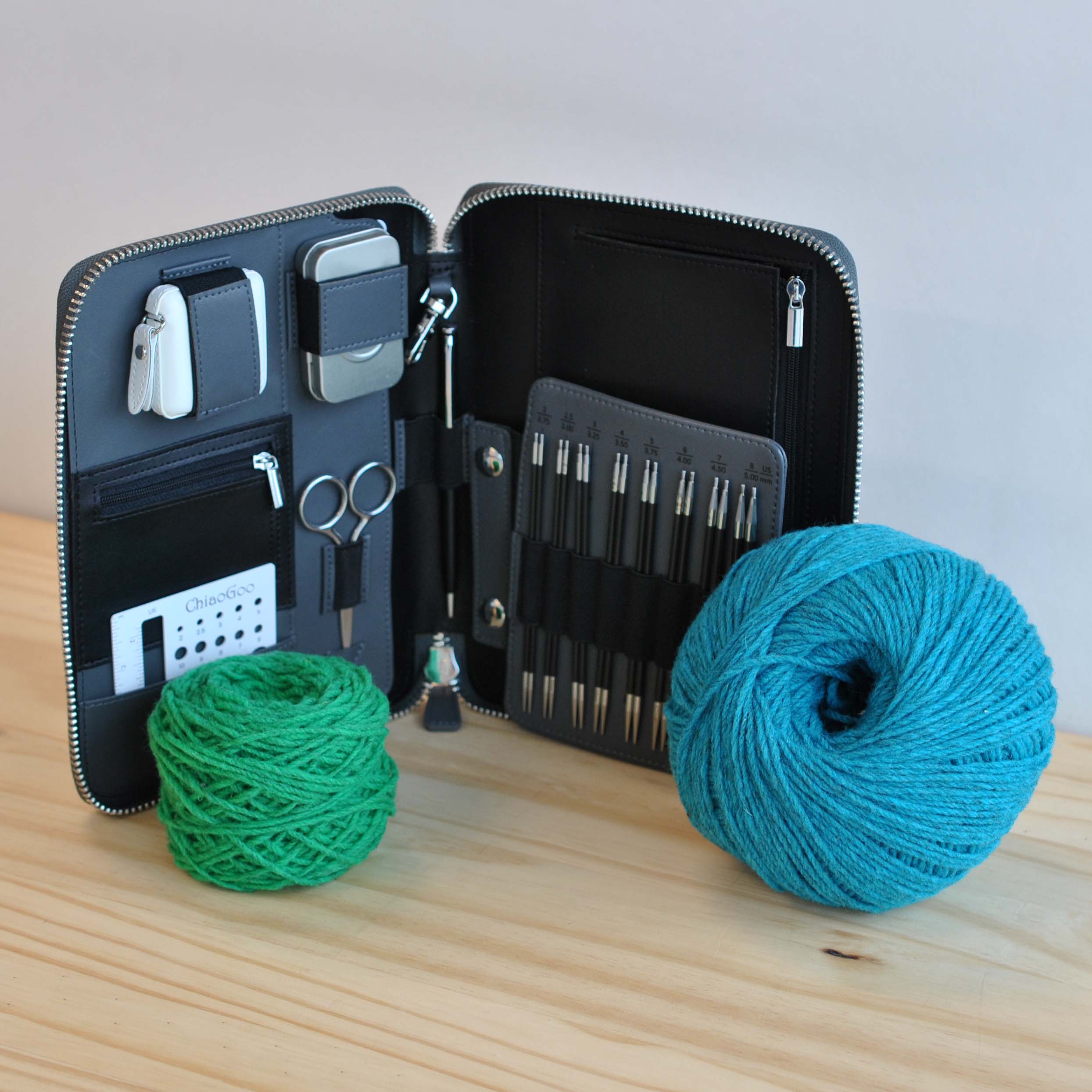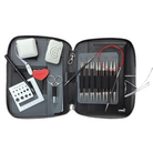 Made of REACH-compliant man-made material, the Forté case is as elegant and functional as the tips and cables. It includes a double-sided, removable needle board that firmly houses all tips, elastic that securely holds but gives easy access to accessories, and four pockets to hold the rest of your knitting supplies, including a spot for your pattern or notes.