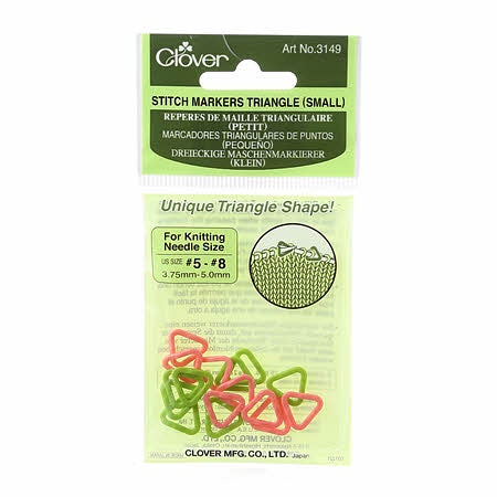 Clover Stitch Markers are great for marking the beginning and ending of pattern stitches, as well as where to increase or decrease the number of stitches. Triangle Small Sz 5-8 16pc- These markers have a specific triangle shape that allows the knitting needle tips to slip in easily when passing the markers from one needle to another. 8 Pink and 8 Green.
