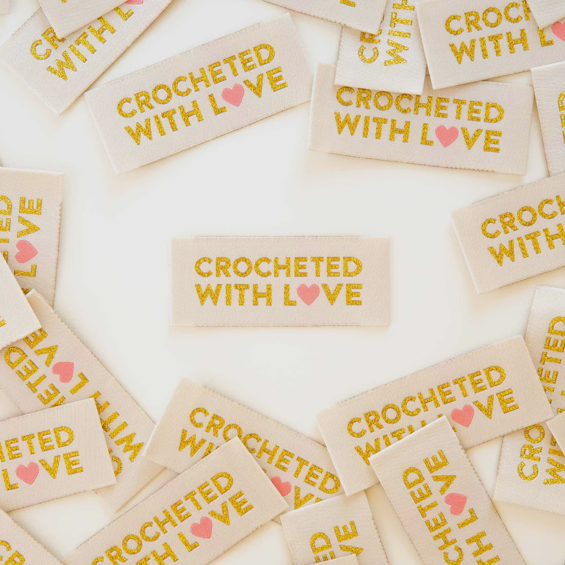 The perfect addition to all crocheted projects! These premium woven labels feature beautiful metallic gold thread and a pinky coral heart on a cream background. The labels are super soft to the touch, never scratchy, and fully machine washable.