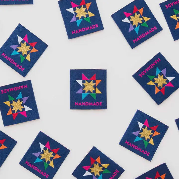 Stand out from the crowd with our Handmade Quilt Star Large Woven Labels! Show off your unique style with the rainbow sawtooth star design and metallic gold center. These labels can be used as a large label or patch, adding a special touch to any handmade garment, quilt, or bag.