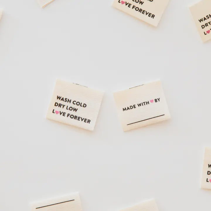 Keep your handmade garments looking like new with our Wash Cold Dry Low Organic Cotton Labels. Made from soft, organic cotton, these labels not only provide wash and dry instructions, but also allow you to personalize your pieces.