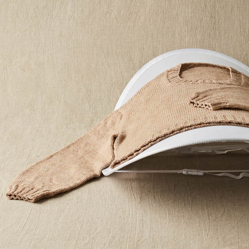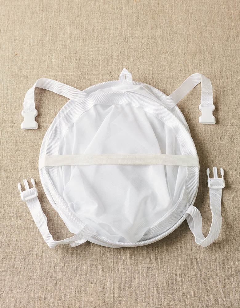 The Sweater Care Pop-up Dryer will help air dry hand washables more quickly by allowing increased airflow above and below your garment. Simply open the Pop-up Dryer, secure with the buckle straps and adjust to the desired height, place it on a towel, blocking mat, or water-resistant surface, and lay your damp item over the mesh.