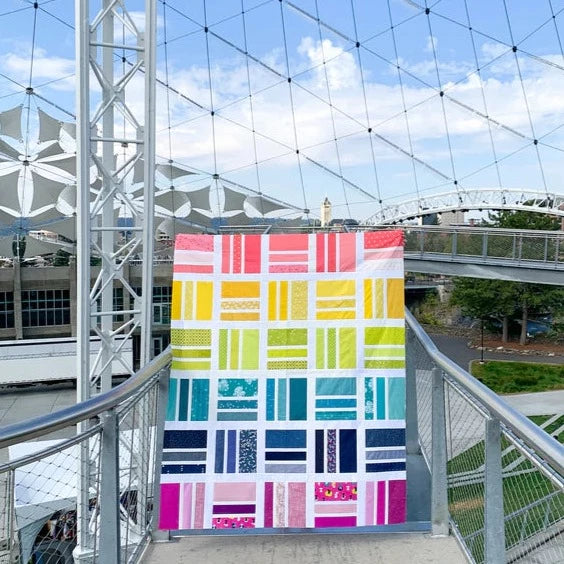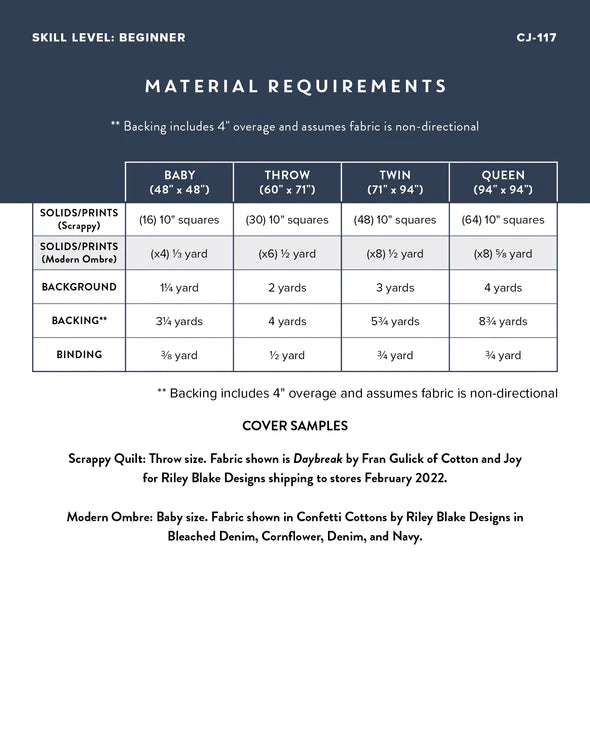 The pattern includes two design layouts: Modern Ombre and Scrappy which is precut friendly (uses 10" Stackers/Layer Cakes)!