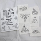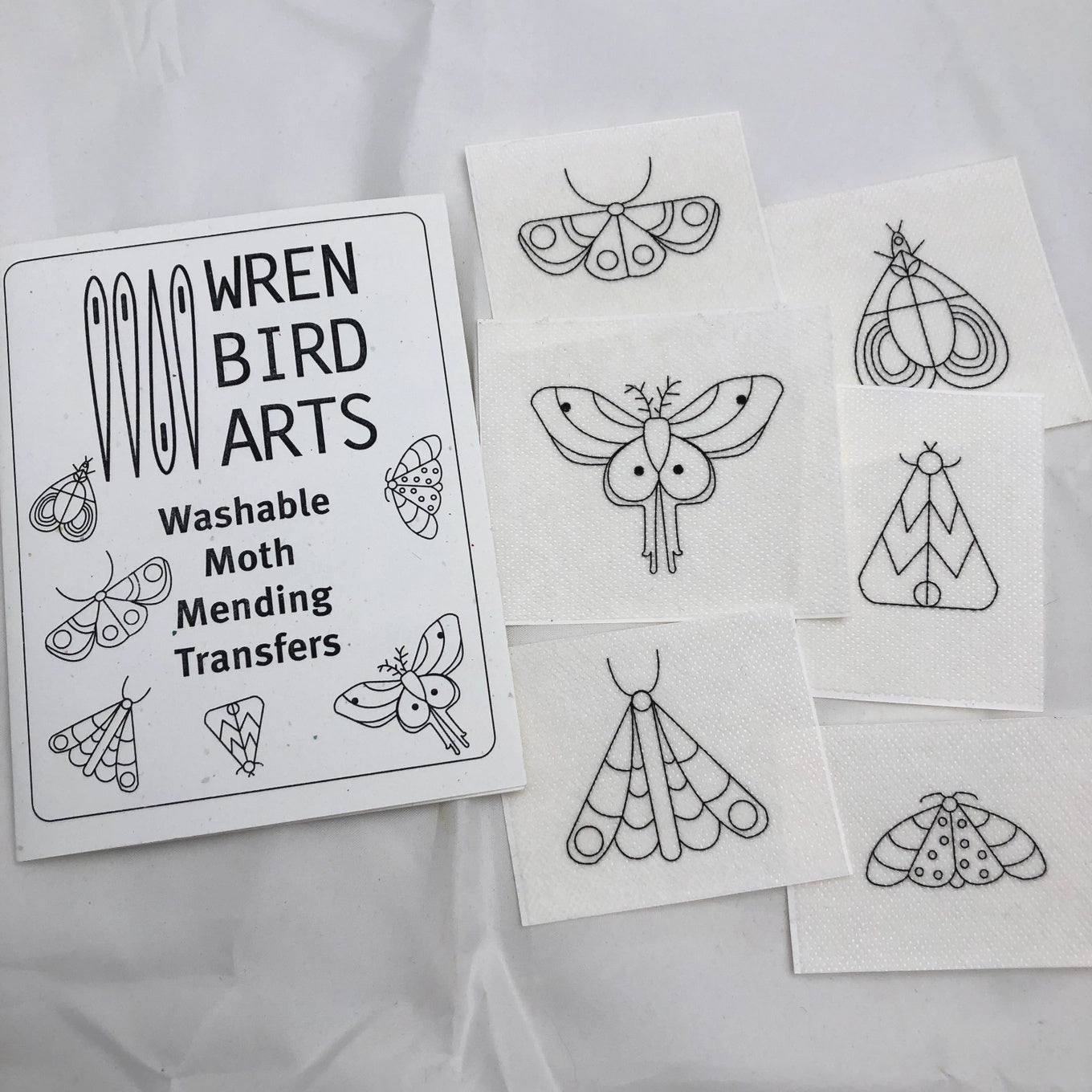 Each pattern is printed on a water-soluble sticker. You unpeel and stick the moth transfer wherever you want to embroider the image. Embroider as you would normally, using the transfer as a guide you stitch into. Once the embroidery is finished, rinse off the transfer in the sink. Let it dry, it's really that easy!