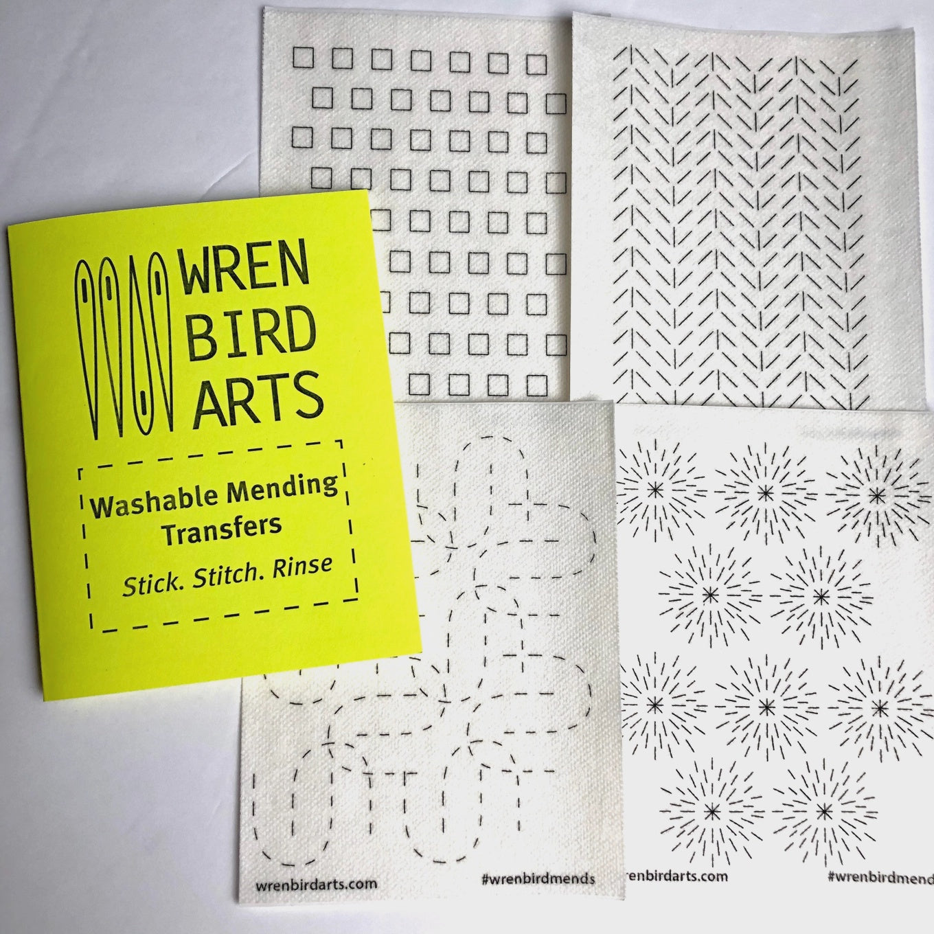 I created these water-soluble mending transfers for people like me who are looking for an easier way to transfer a beautiful pattern. No need for rulers and pencils, tracing paper, or an iron. Stick the transfer to the area to be mended, stitch the pattern, and then rinse off the sticker, and reveal your precise stitched pattern.