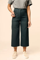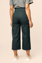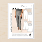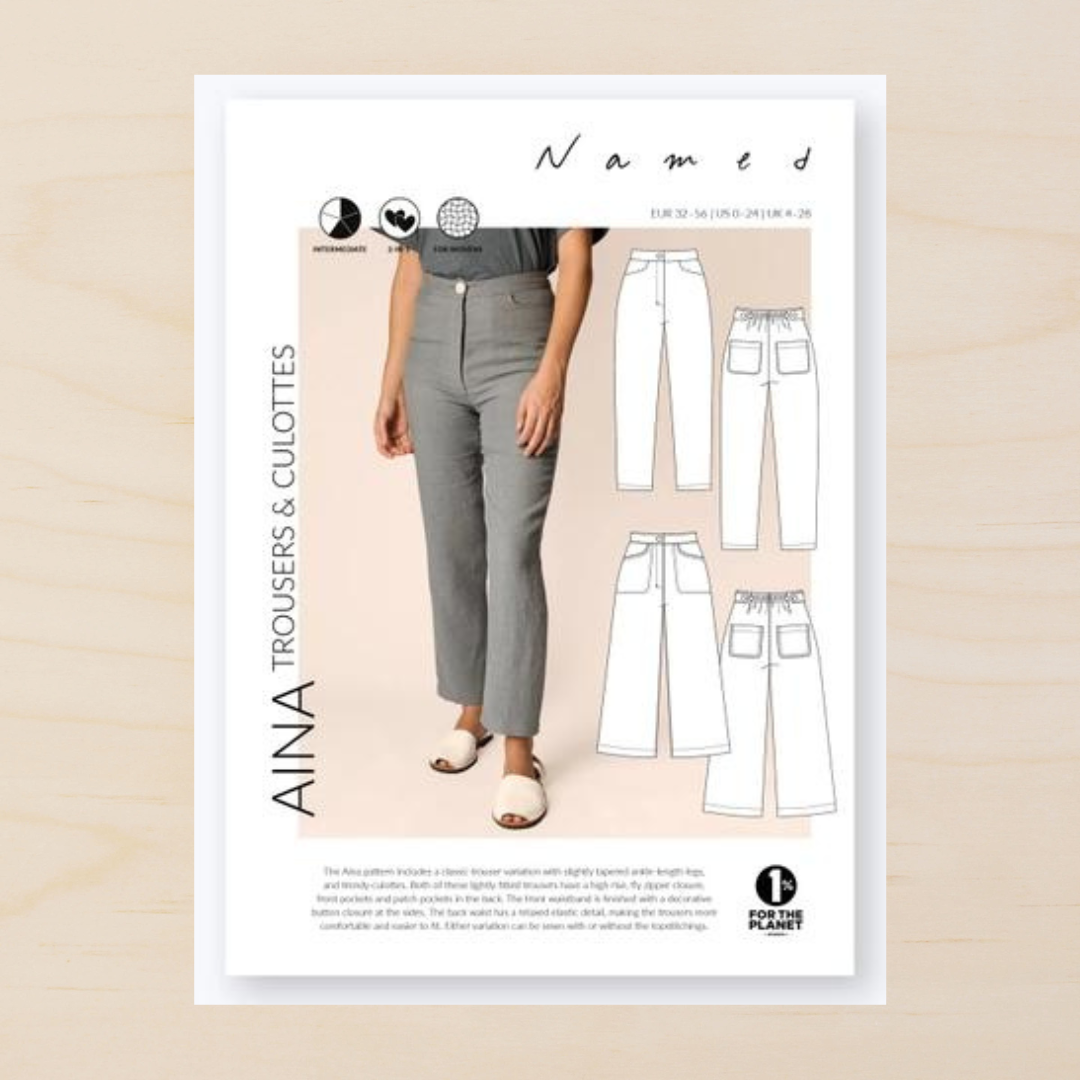 The Aina sewing pattern includes two variations: Classic trousers with a slightly tapered ankle-length leg, and trendy culottes. Both of these lightly fitted pants have a high rise, fly zipper closure, front pockets, and patch pockets in the back. The front waist is finished with a classic waistband with a decorative button closure at the sides. The back waist has a relaxed elastic detail, making the trousers more comfortable and easier to fit. Either variation can be sewn with or without the decorative topstitchings.
