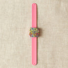 One of the many advantages to knitting is that you can take it with you everywhere! And, in the process, lose little knitting notions everywhere! I wanted a way to truly contain all my knitting tools while traveling – so I came up with the Maker’s Keep magnetic bracelet. It is a slap-bracelet so it fits everyone (one size truly fits all here). You can wear it, or simply drop it in your knitting tool bag to keep all the tools together – or even unfurl it and push the magnet to one end to use it as a straight edge while reading down a pattern.