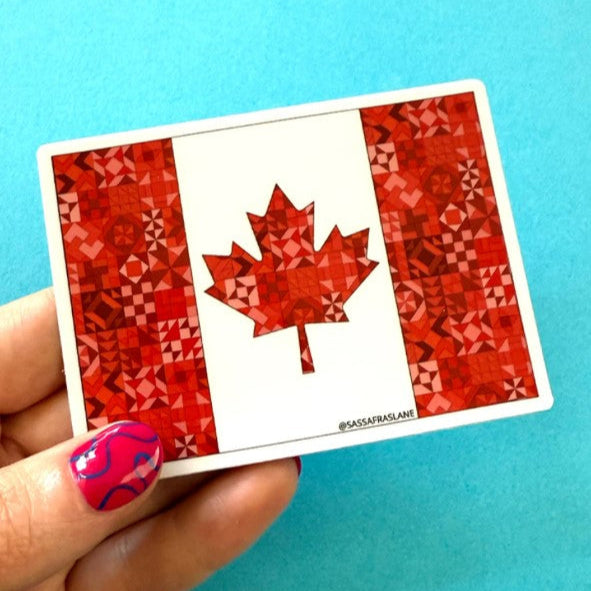 The Canada Quilt Sticker is the Canadian flag filled with traditional quilt blocks. All our die cut stickers are made of a thick durable vinyl with a protective laminate coating. This makes the sticker resistant to fading, scratching and water.