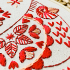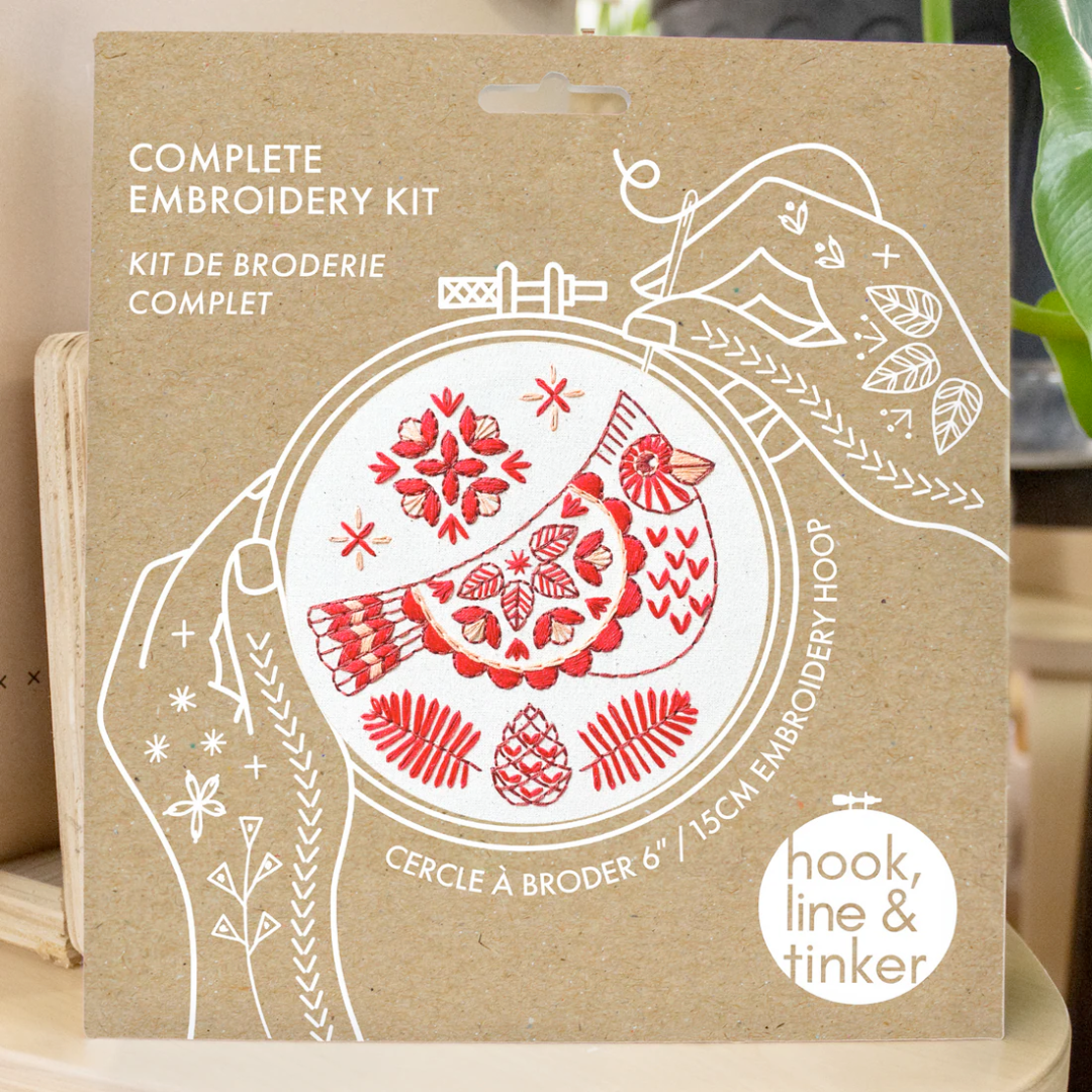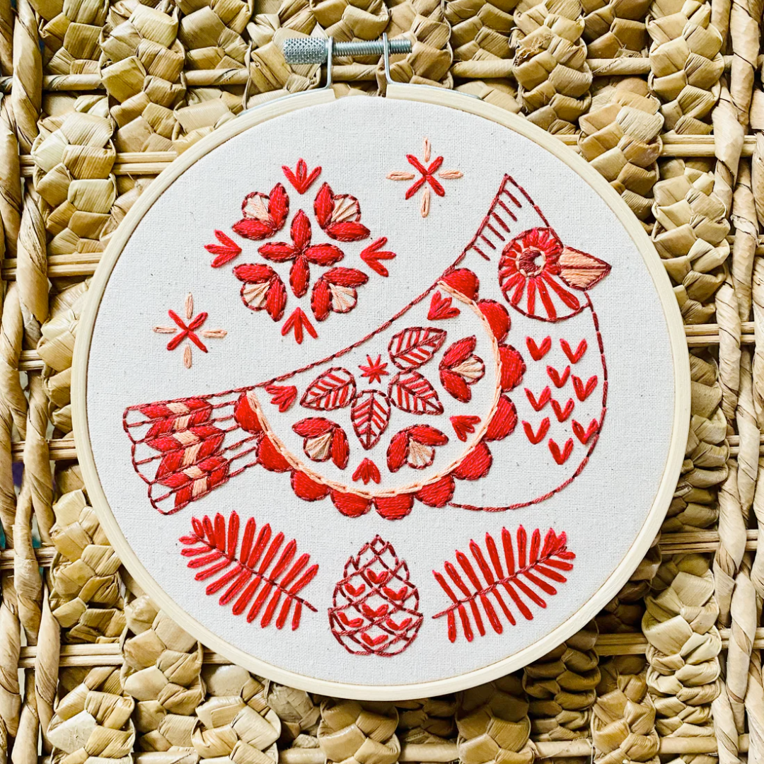 The Cardinal pattern has a unique tonal palette of 3 bold colours and features a sampler combination of satin, link, chain, and back stitch. Designed in Hook, Line, and Tinker's signature modern, Scandi / Nordic inspired folk style.