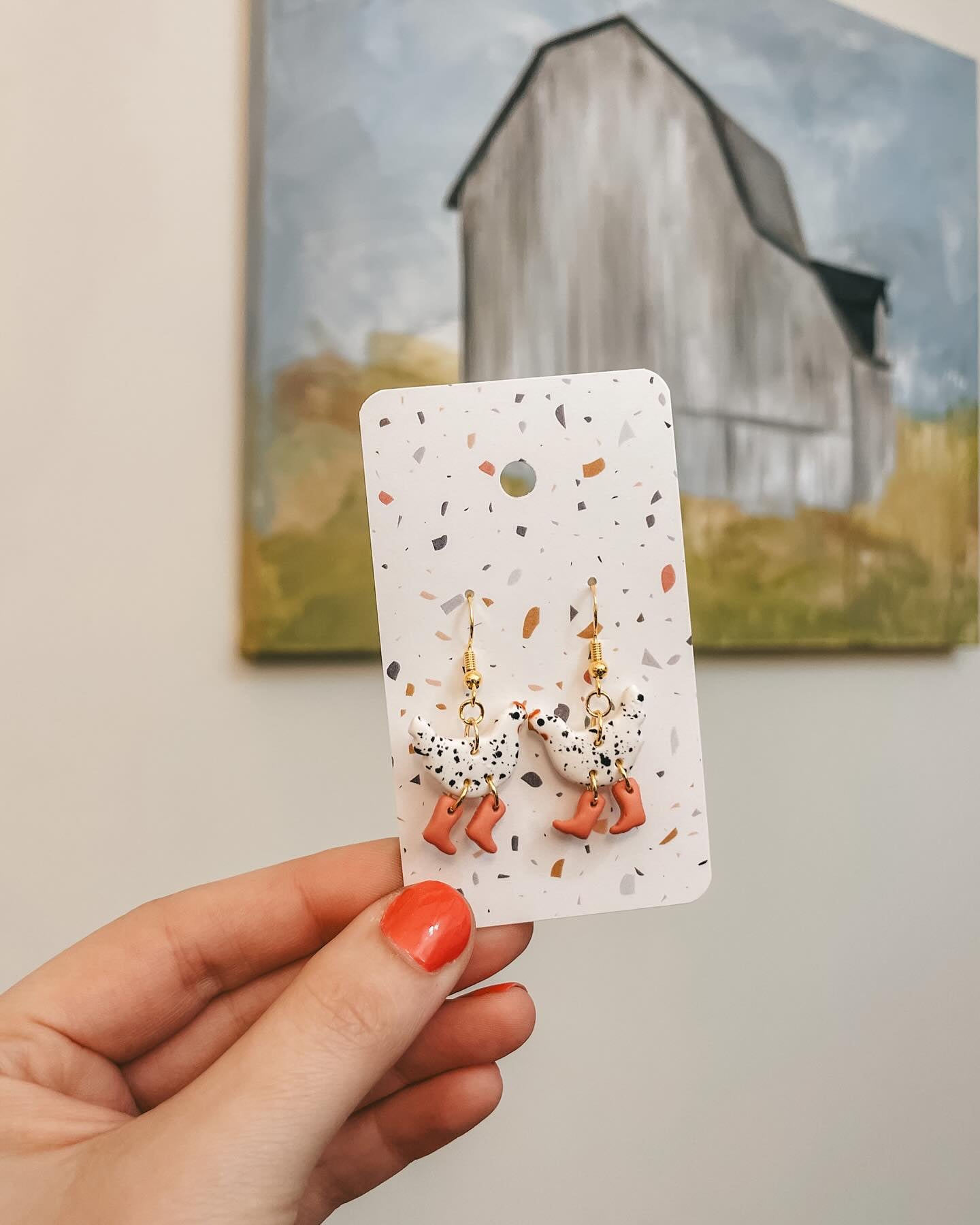 Cute + playful pair of earrings with hand-painted details! Who can be mad while wearing chickens in rain boots?