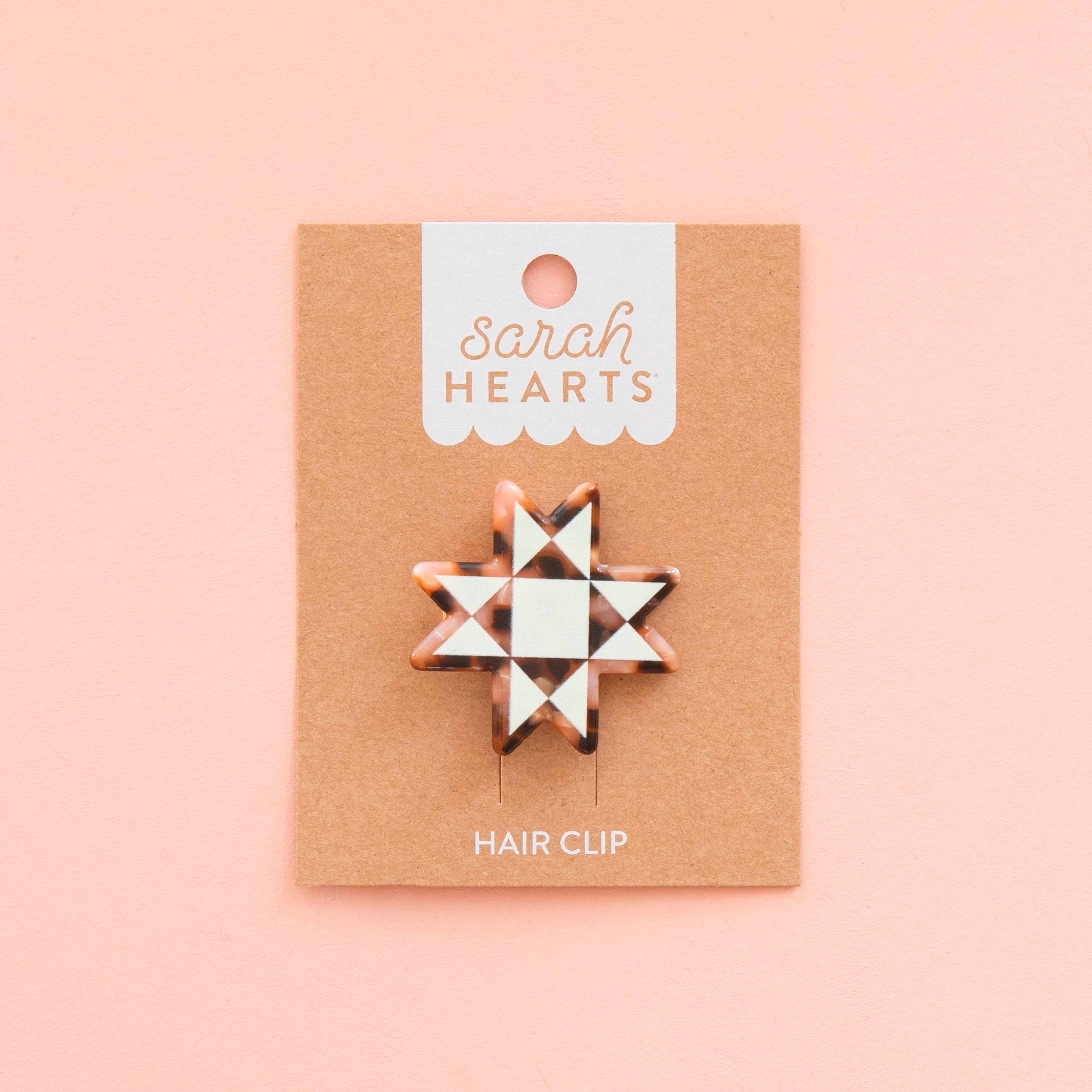 Elevate your hair game with our Quilt Star Hair Clip, inspired by the timeless sawtooth star quilt block. Featuring a chic blend of brown and blush pink tortoise shell with a cream screen-printed design, this petite barrette brings a modern twist to a classic motif. Crafted from plant-based acetate and secured with a gold alligator clip, it’s as stylish as it is sustainable. Whether you’re heading to a quilt guild meeting or just love a handmade touch, this clip is the perfect accessory for any sewist or maker on the go.