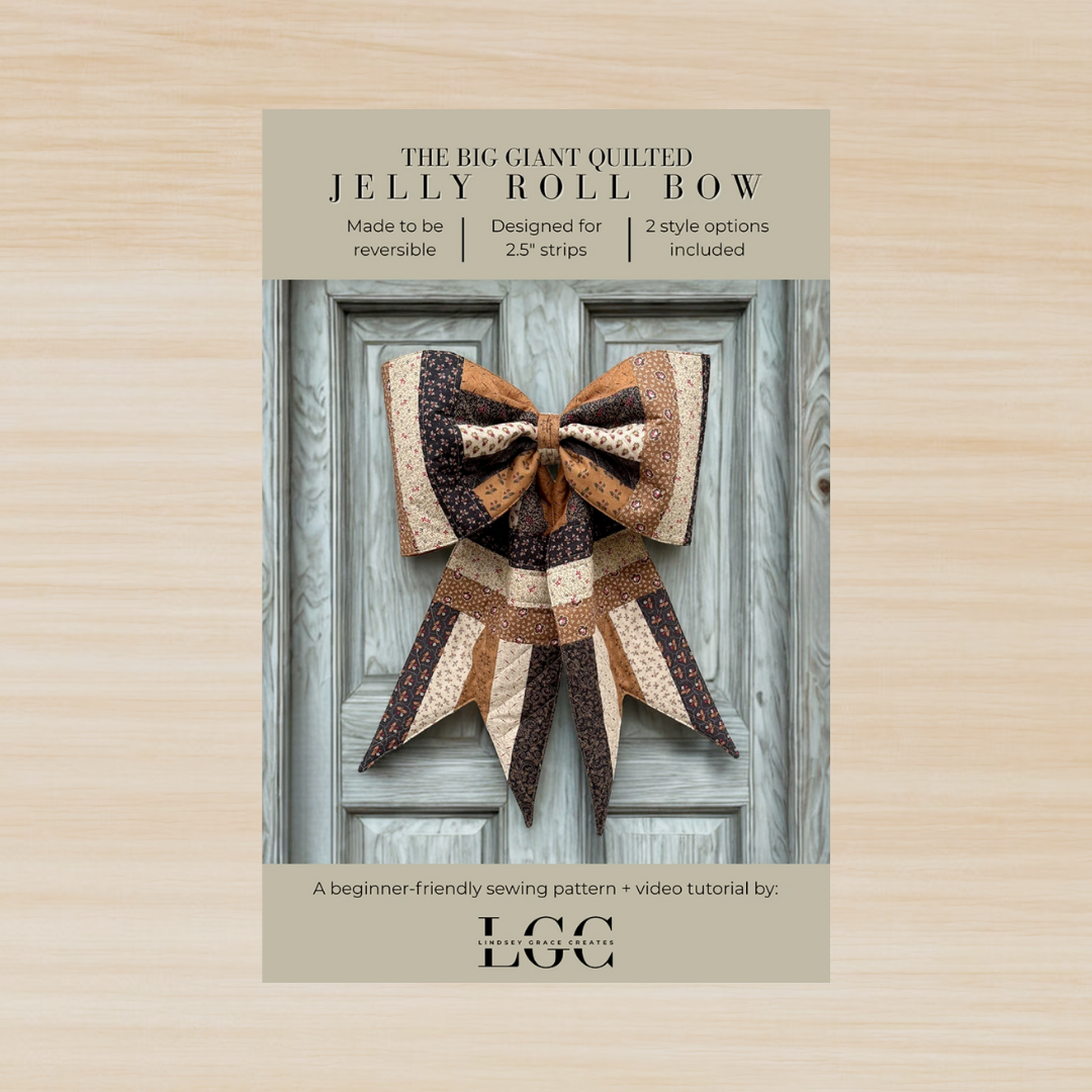 Make a statement with The Big Giant Quilted Jelly Roll Bow — a new take on the original and best-selling quilted bow pattern by Lindsey Grace Creates. This beginner-friendly pattern walks you step-by-step through creating a stunning oversized bow that’s perfect for holiday décor, wreaths, gifts, photo props, nursery accents, or sewing room wall art.