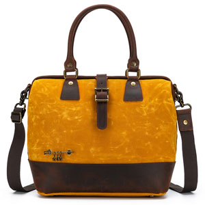The Maker's Canvas Satchel comes equipped with a hard case opening and flat solid bottom, two secure clasp closures, and plenty of pockets and room for projects. Outfitted with antique bronze hardware , five bottom feet to prevent scuffing on the floor, detachable strap, yarn feeder and yarn cutter, dot journal, a darning needle, and a pin with three lotus stitch markers.