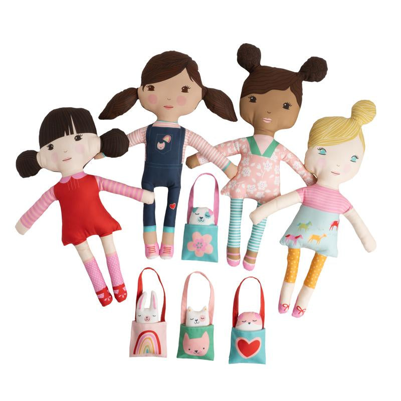 Best Friends Forever panel by Stacy Iest Hsu includes 4 - 15" dolls, an animal friend and a cross body tote