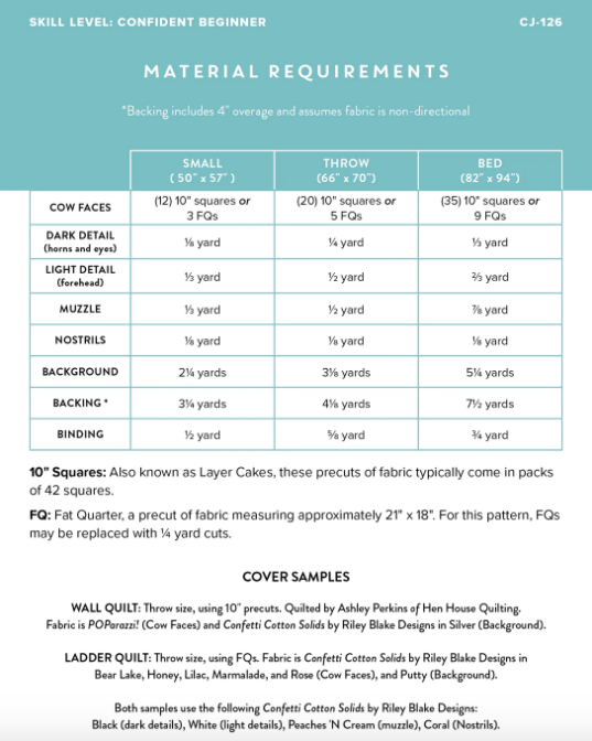 She's quirky, she's fun - meet Annabelle. This traditionally pieced quilt pattern features a playful and modern cow design. Get creative and let your imagination run wild with two fabric options - layer cakes or fat quarters - and three sizes.