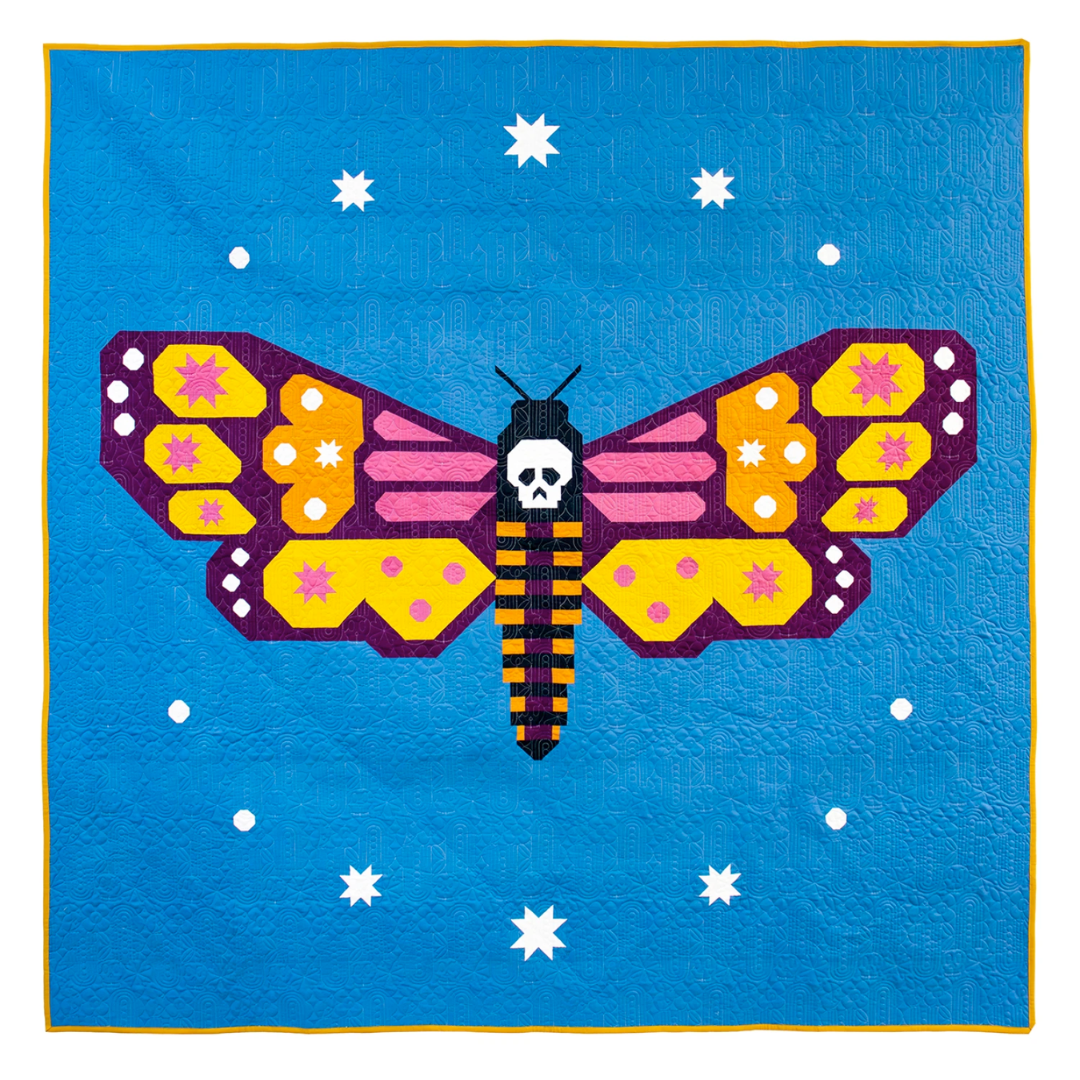 Embrace the shadows and the natural world's intriguing blend of beauty and the macabre with Night Flutter, a 70 ½” x 70 ½” traditionally pieced tribute to the enigmatic Death’s-Head Hawkmoth. This striking design celebrates one of nature’s most mysterious creatures, seamlessly blending realistic moth markings with mystical star motifs to create a centerpiece that feels both grounded and celestial. While the pattern naturally leans toward a moody, seasonal Halloween aesthetic, it is intended for year-round display by those who find magic in the dark and the divine.