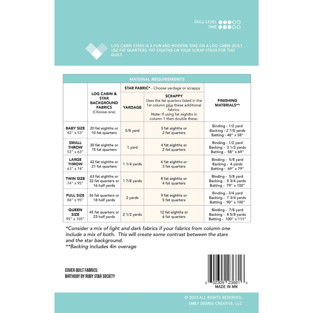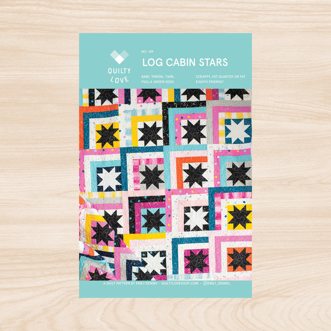 Log Cabin Stars is a fun and modern take on a log cabin quilt. Log Cabin Stars is fat eighth or fat quarter friendly. The pattern includes 6 size options; baby, small throw, large throw, twin, full and queen.