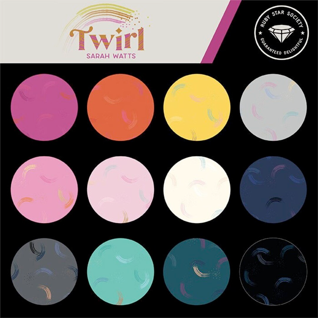 This 5" Charm Pack precut bundle includes 42 pieces from the Twirl collection by Sarah Watts for Ruby Star Society.