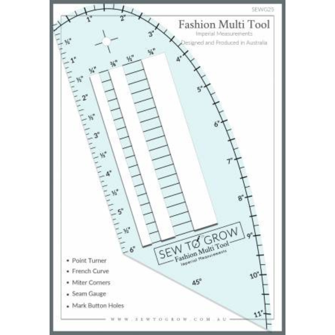 If you are serious about learning to make clothing or are already an avid seamstress then the Fashion Multi Tool is everything you need for designing and making garments all in one convenient and compact tool. This tool features a french curve, seam gauge, point turner, mitering tool, hemmer and button hole placement. This tool is made from 1/8in thick acrylic making it easy to mark with and follow along the curves and is in imperial measurements. Take the Fashion Multi Tool with you to class, or have it hanging in your sewing room, with-in easy reach, with the convenient hang hole. Directions on how to use this tool are included in the packaging.