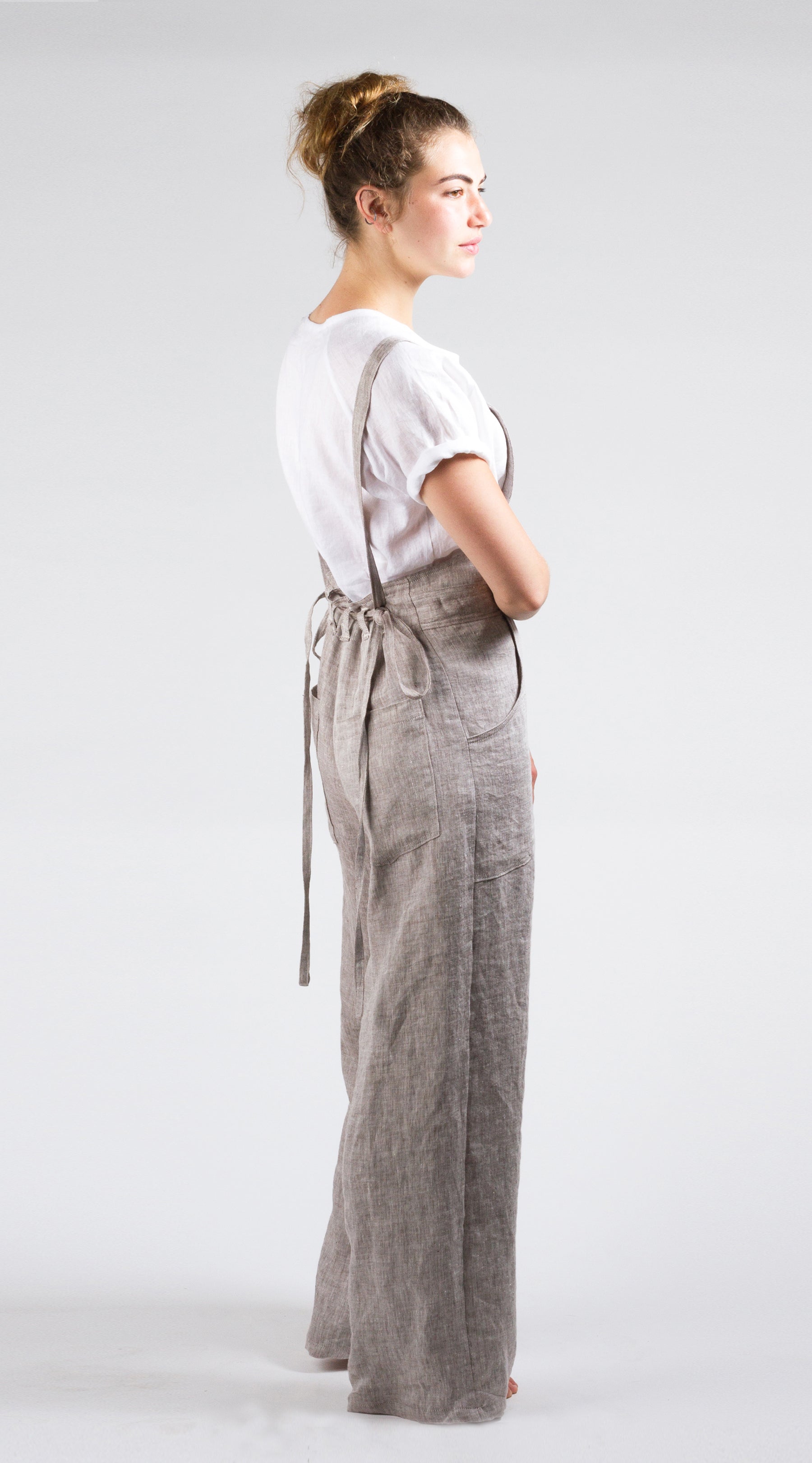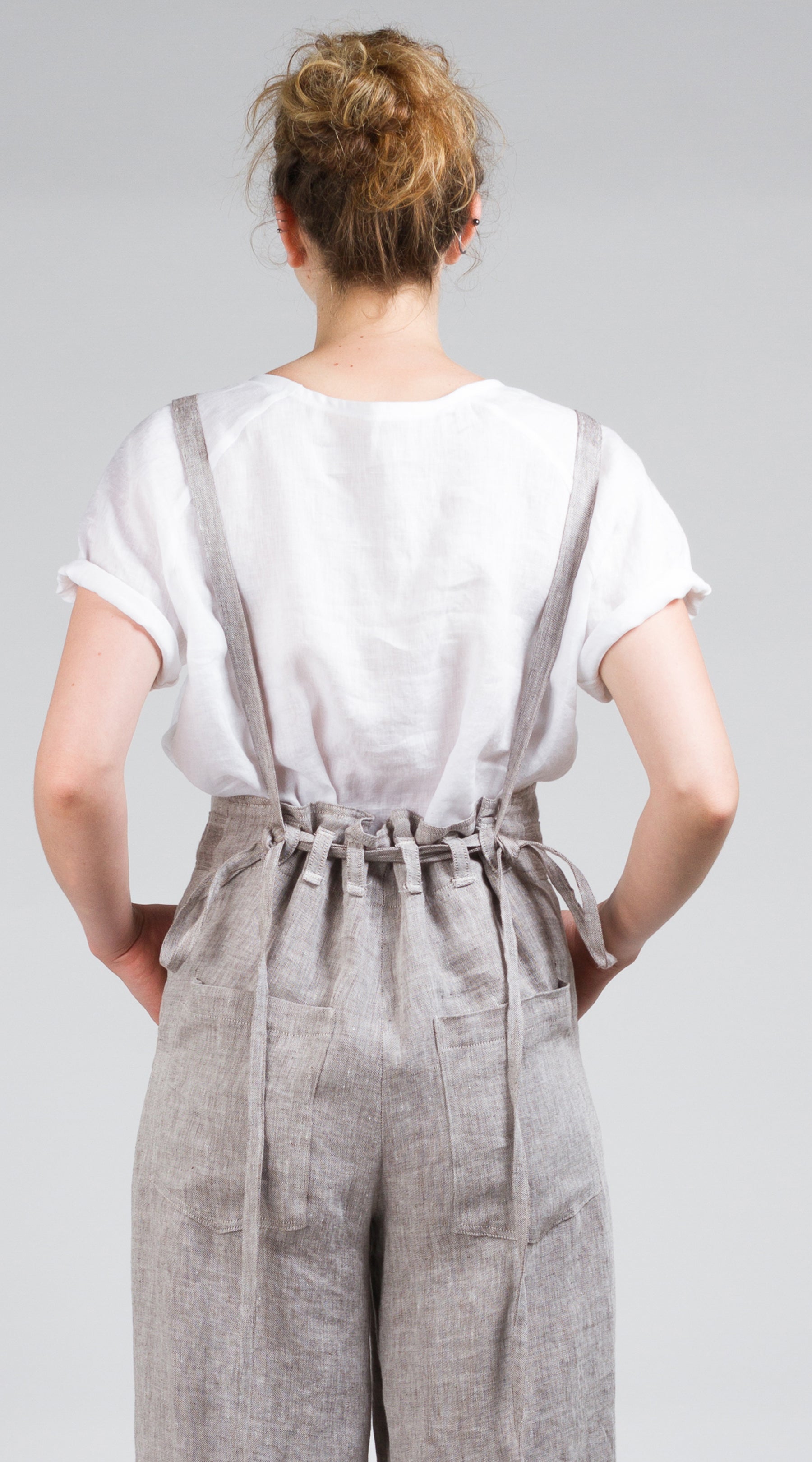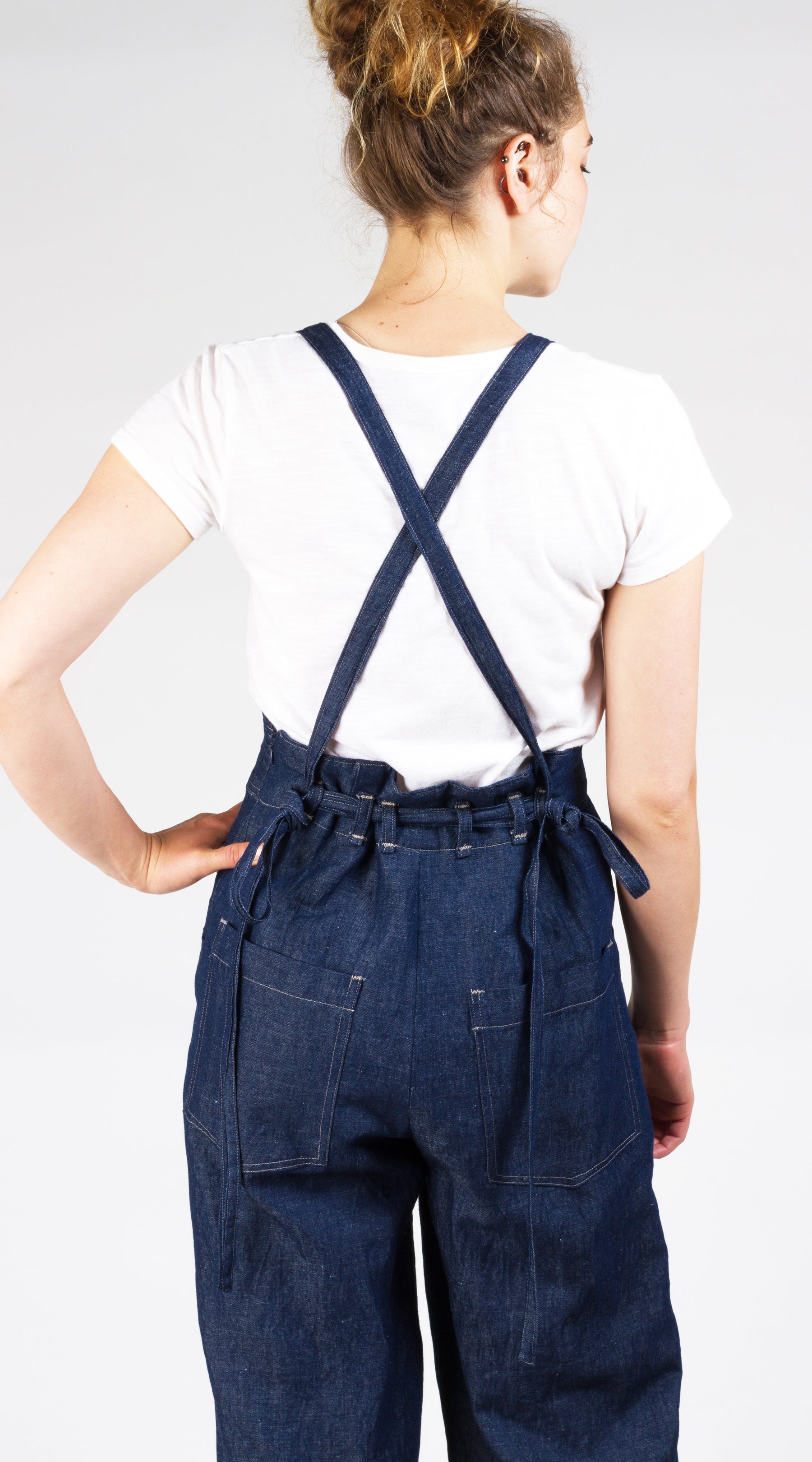 Both versions also feature a front waistband, curved front patch pockets, optional back pockets, and cross-back straps that transition to narrower ties that thread through back waist belt loops forming back waist gathers. They may be tied in many ways - at the back, front or sides. The legs are somewhat wide and can be made full length or cropped.