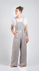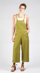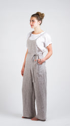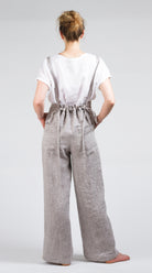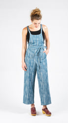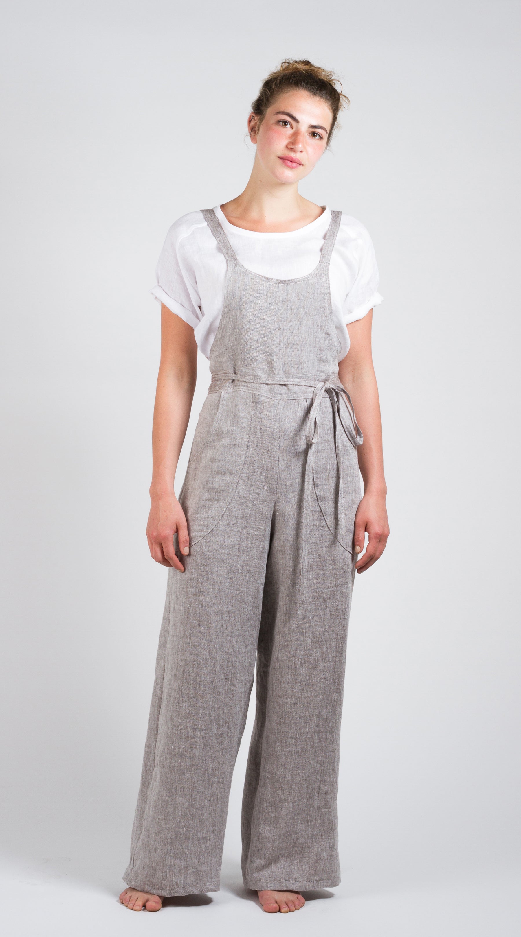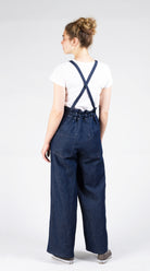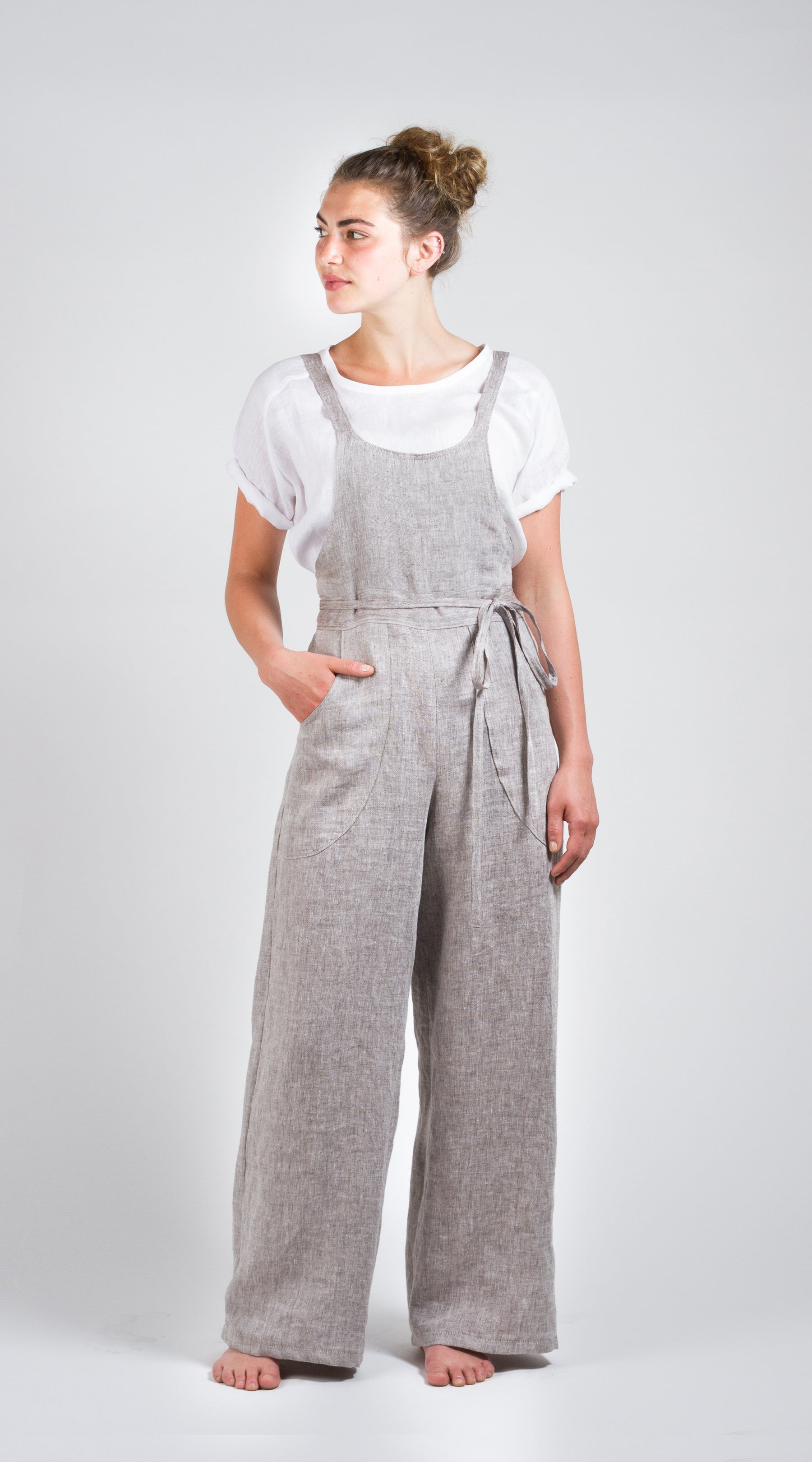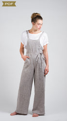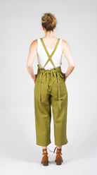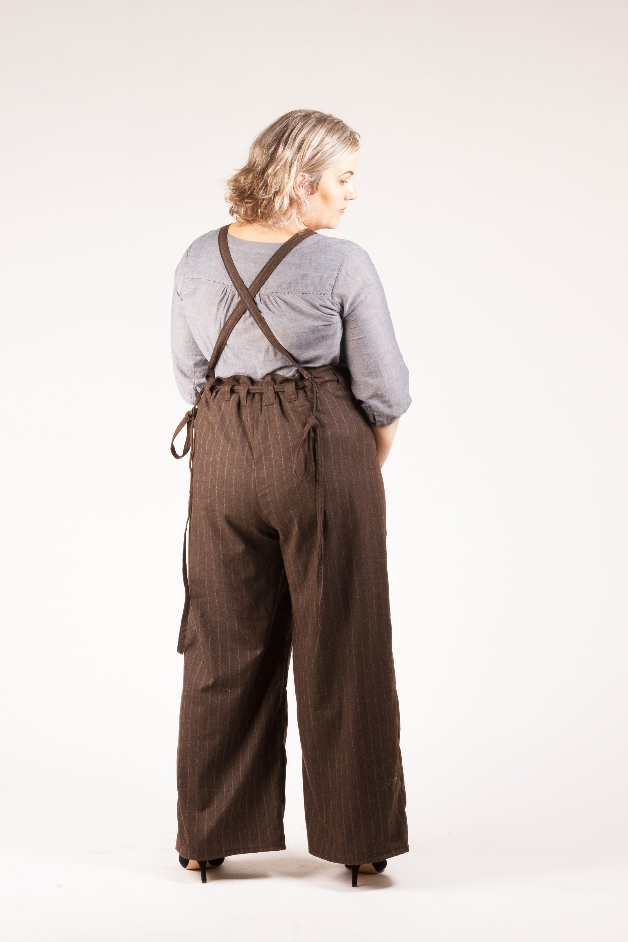 Both versions also feature a front waistband, curved front patch pockets, optional back pockets, and cross-back straps that transition to narrower ties that thread through back waist belt loops forming back waist gathers. They may be tied in many ways - at the back, front or sides. The legs are somewhat wide and can be made full length or cropped.