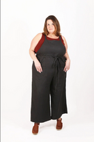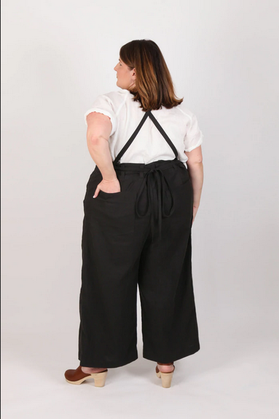 Both versions also feature a front waistband, curved front patch pockets, optional back pockets, and cross-back straps that transition to narrower ties that thread through back waist belt loops forming back waist gathers. They may be tied in many ways - at the back, front or sides. The legs are somewhat wide and can be made full length or cropped.