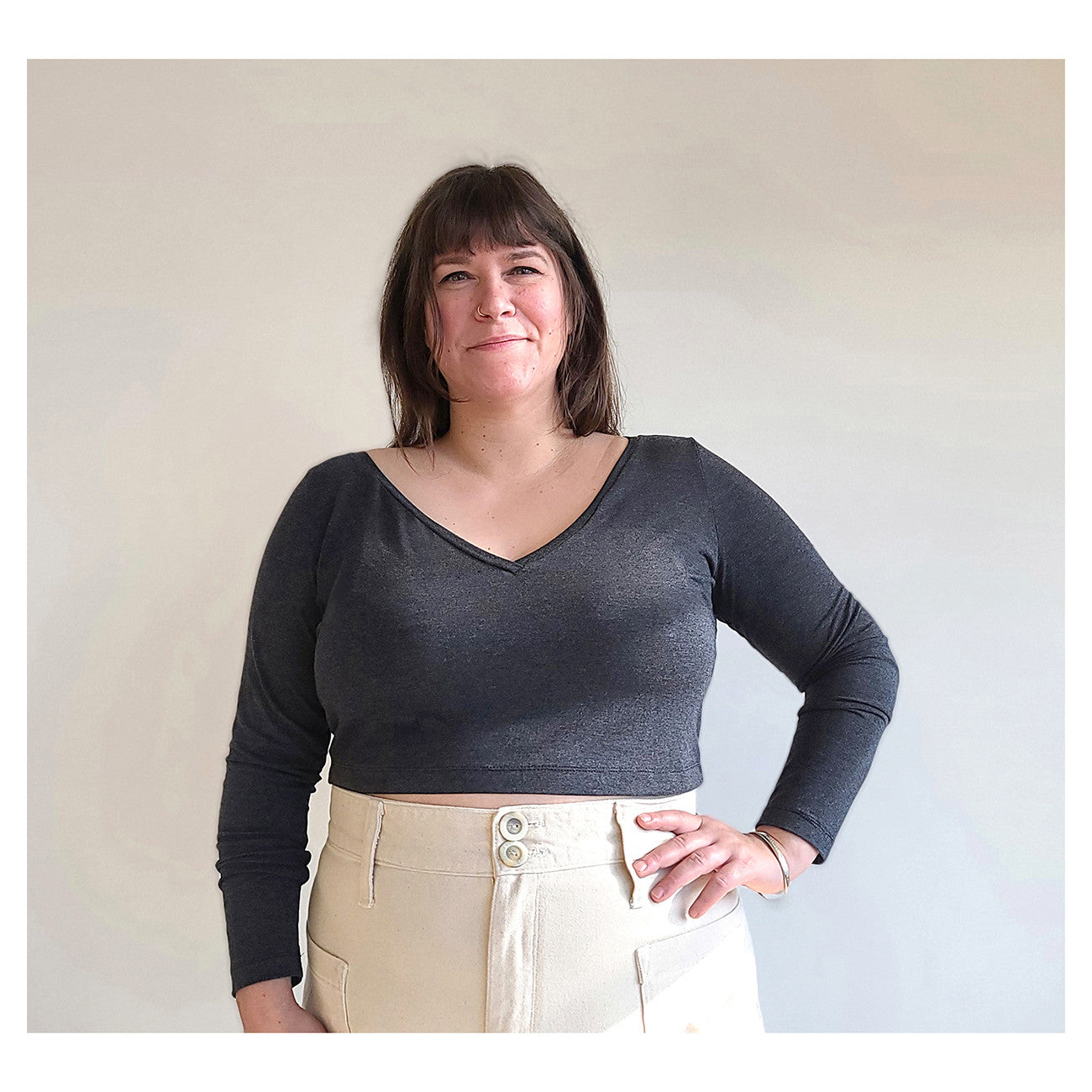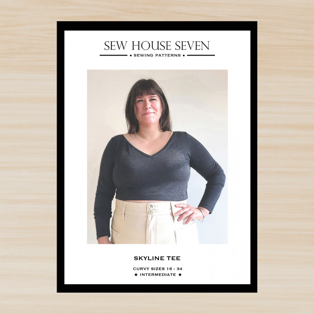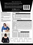 The Skyline Tee (sizes 16-34) is a classic, fitted, body-con t-shirt designed for stretch knits. There are five different necklines to choose from - a low scoop front, a low scoop back, a high back, a jewel neck or two V-neck variations. There are four different sleeve options - a long slim sleeve, an elbow length slim sleeve, a gathered long sleeve and a cap sleeve. There are two hem lengths - hip length and cropped. Make a t-shirt for every season.