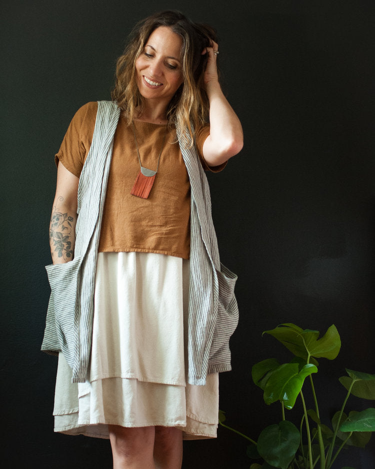 The Strata is designed to be both a practice of meditation and a canvas for artistic inspiration. It is simple in its construction – only three pattern pieces – easy to fit, and effortless to wear. The uniquely curved hem adds elegance to this staple piece.