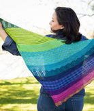 Fifteen hues in rich vibrant tones are enough to delight anyone, but the added blend of lace and easy colourwork takes it over the top. Knitters of every level will find pure joy in working this asymmetrical triangular shawl.