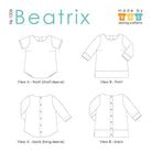 Beatrix is a button-back pullover top with a simple silhouette that is both comfortable and flattering. With two views that offer different sleeve lengths, button placket options, and a shirttail or banded hem, this is a truly versatile pattern for woven fabrics. This modern wardrobe basic is sure to become a new favorite!