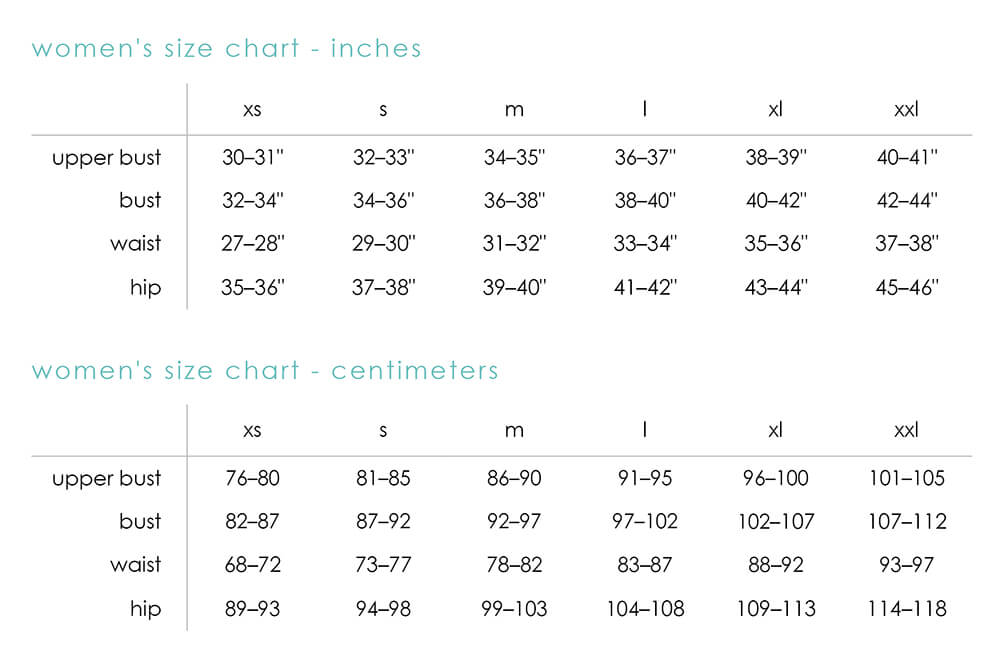 Sizes: six women’s sizes, XS-XXL, with two front bodice pieces to fit either A/B or C/D cup sizes.