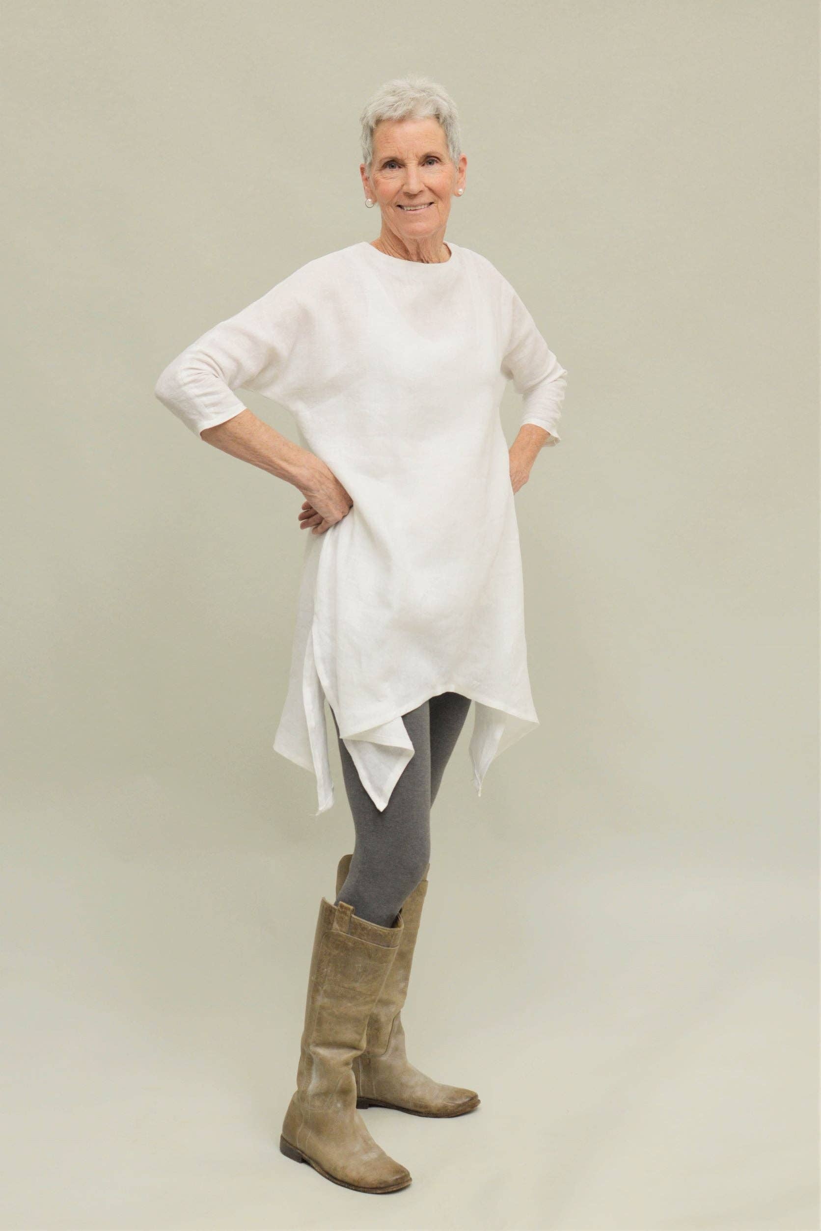 While the word tunic comes from the Latin tunica, the tunic was not invented by the Romans. Examples of garments that cover the torso and the top of the legs, with sleeves and side seams, can be found in ancient art from South America to South East Asia and are worn worldwide today. This easy-sew tunic sewing pattern features a handkerchief hem, side vents, and dolman, three-quarter length sleeves. The fit is roomy and loose, making a comfortable and stylish piece to wear over leggings or jeans. The high neckline is closed in the back with a hook-and-eye at the slit. Gorgeous in silk for a dressy look or perfect in a rumpled linen, this tunic can be an everyday piece to wear again and again.