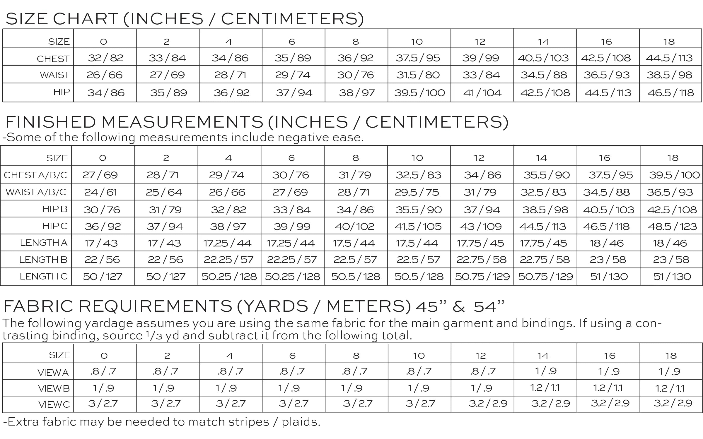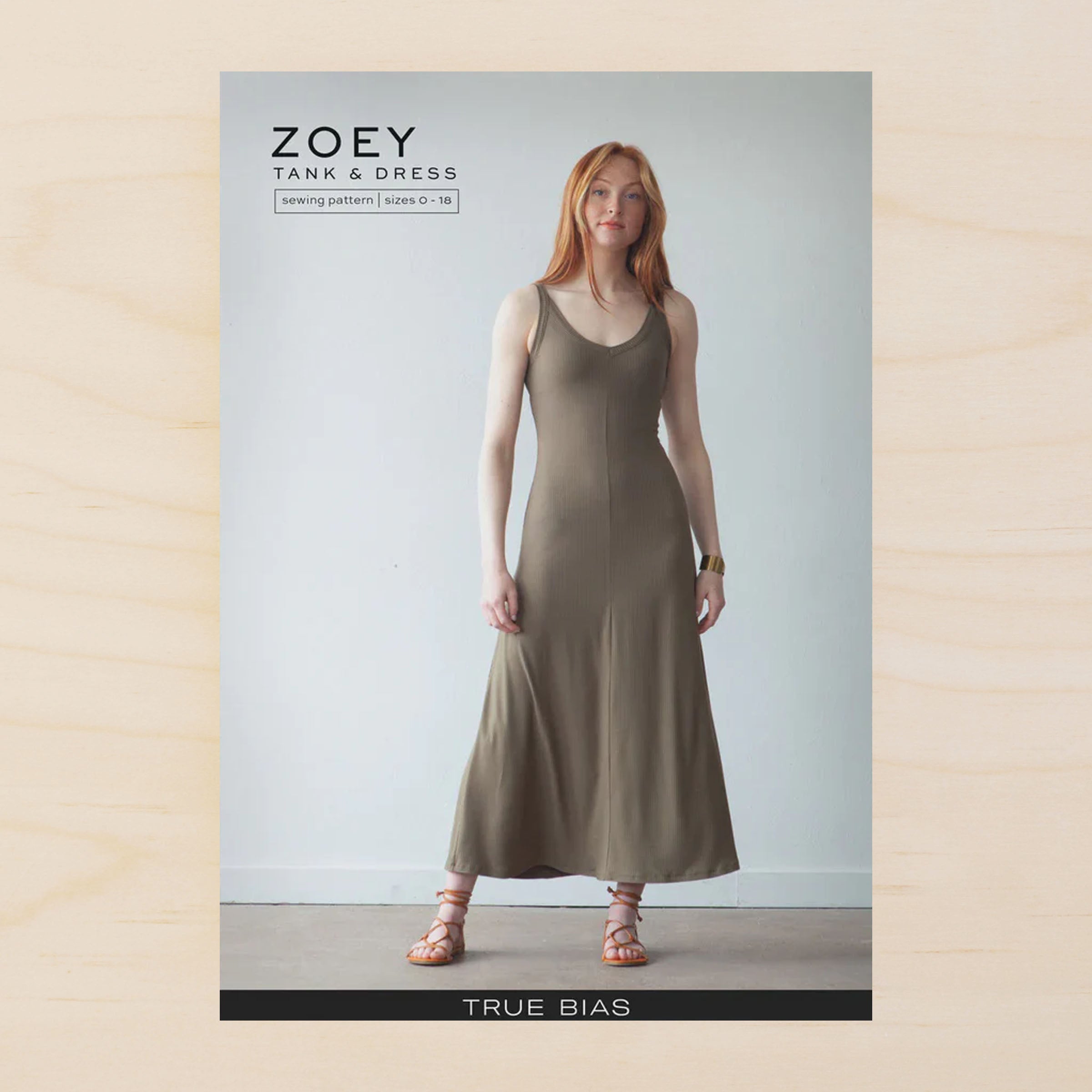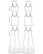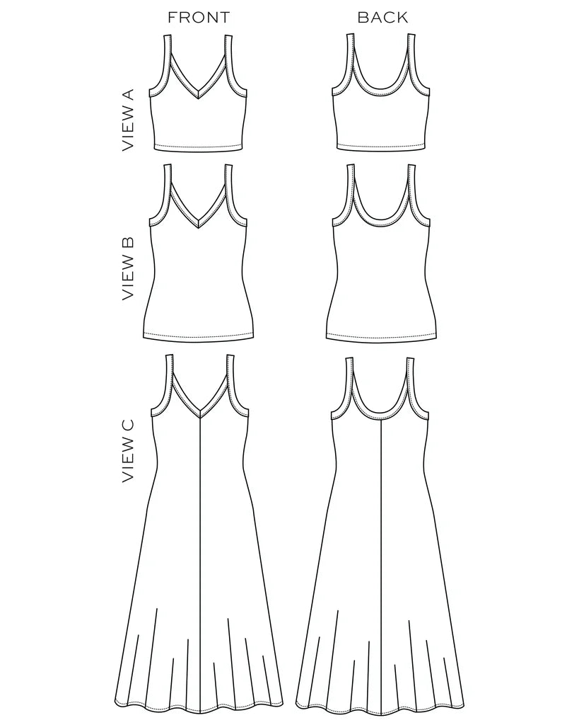 The Zoey pattern is a fitted knit tank top and dress. All views have a soft front V and low scooped back neckline. Armholes and necklines are finished with 5/8” wide bands. Views A and B are tank tops where View A has a cropped length hitting around the natural waist and View B ends around the hipline. View C is a fit and flare tank dress with a center front and back seam for extra shaping and the hem ending a few inches above the ankle.