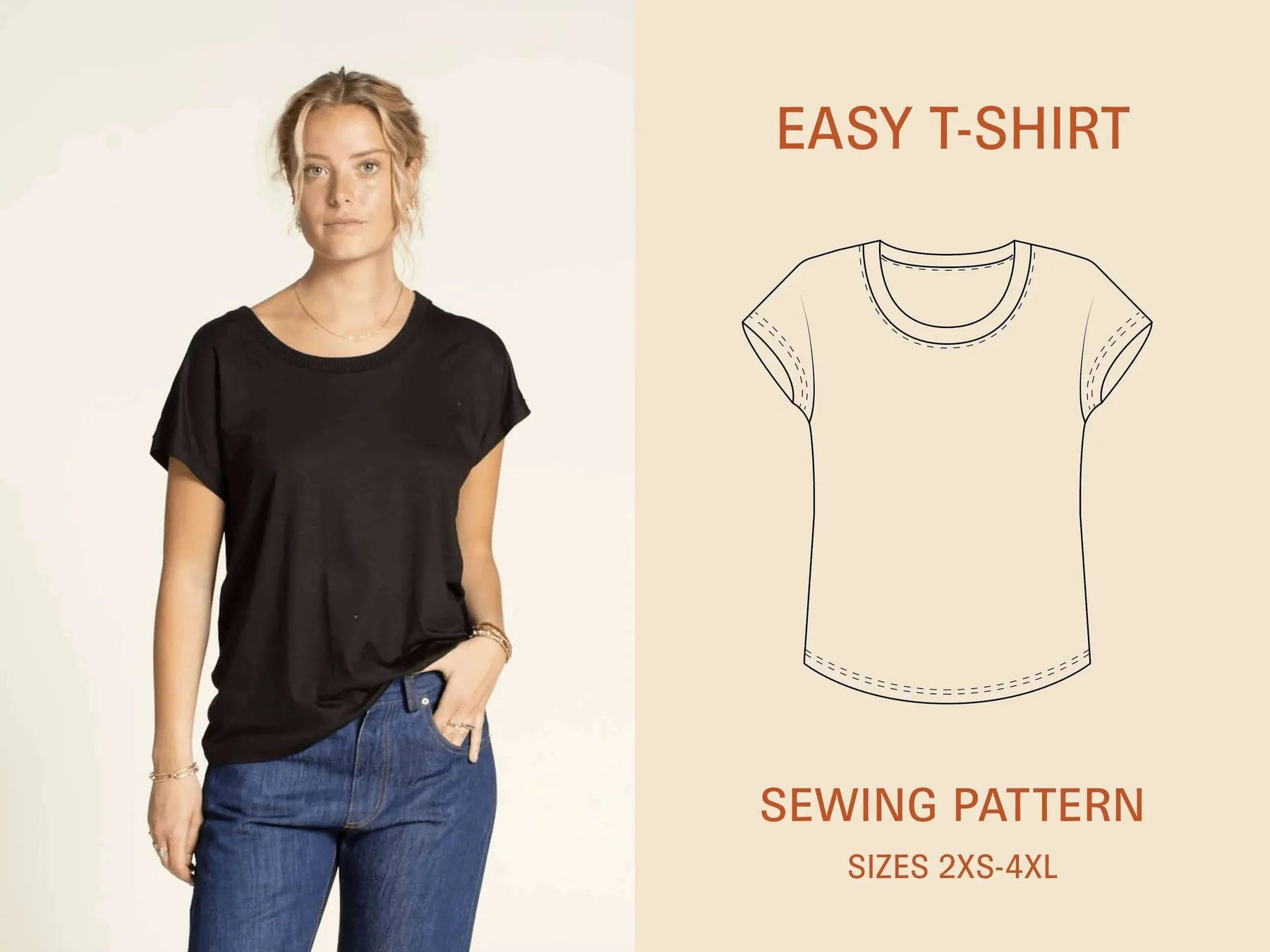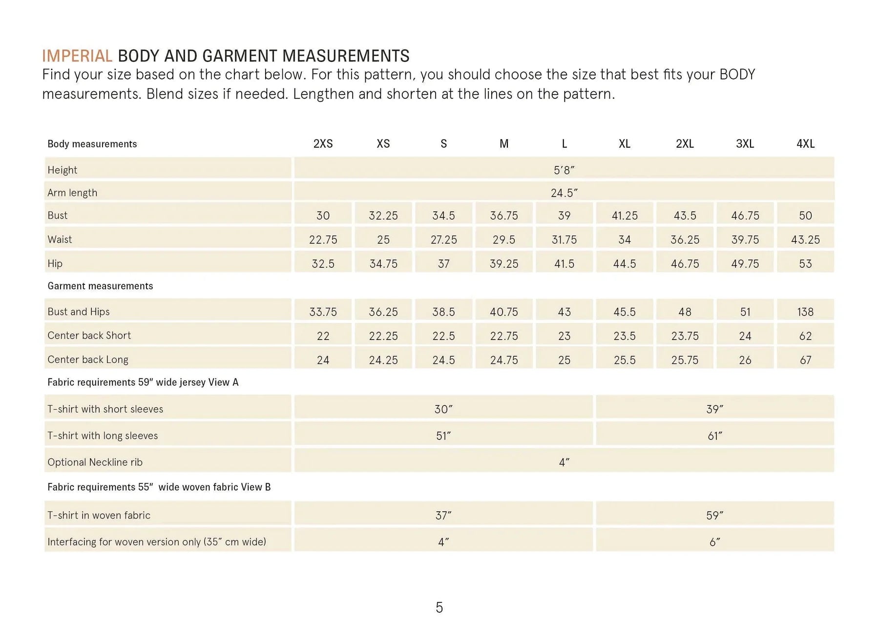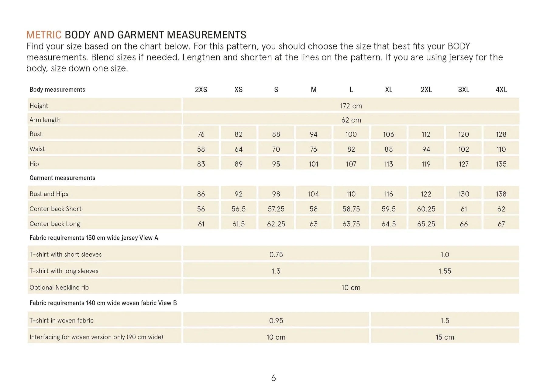 Flip through the images to find fabric requirements and measurements for the Easy T-Shirt pattern.